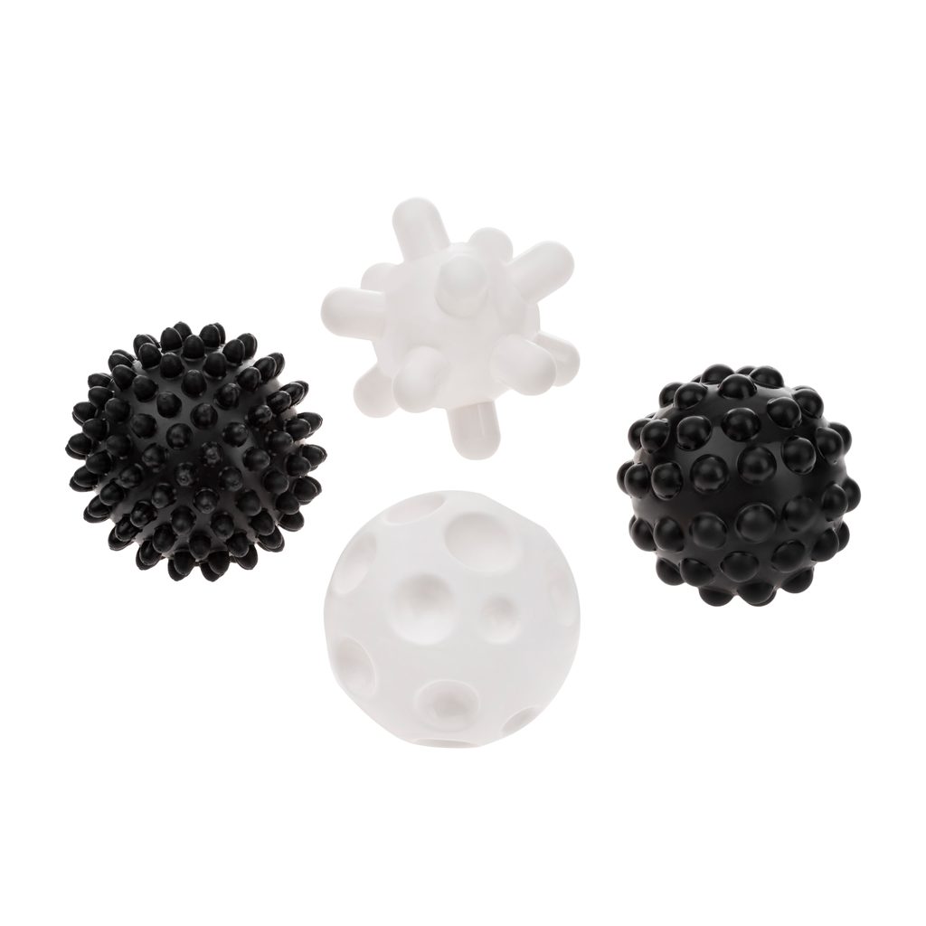 Sada 4ks měkkých senzorických míčků v černo-bílé kombinaci z edukační řady Edison značky Akuku: měkké míčky, každý s jinou 3D strukturou povrchu poskytující odlišné hmatové vjemy, stimulují smyslové receptory a podporují rozvoj motoriky, hodjně se využívají při cvičení a rehabilitaci, omyvatelný…