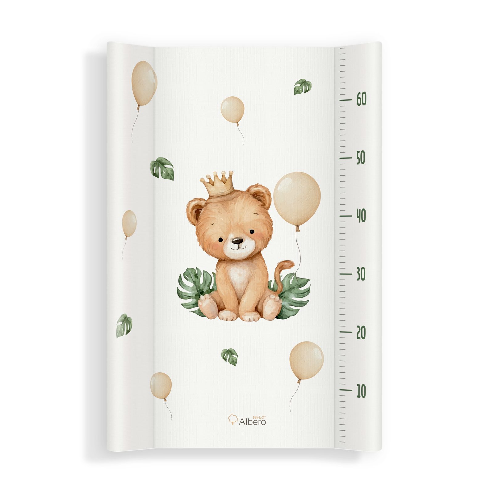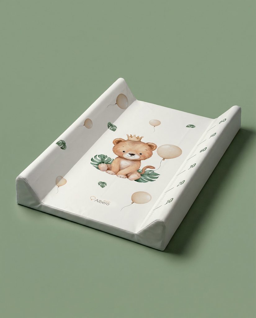 Profilovaná, měkká přebalovací podložka o rozměru 70x47cm značky Albero Mio - design (449) Safari Party: určená k umístění na přebalovací komody, pulty, stoly (tj. na pevné a stabilní podklady), 2-hranná profilovaná (2 zvýšené boční hrany), měkká výplň z polyuretanové pěny, povrch z bezpečné PVC…