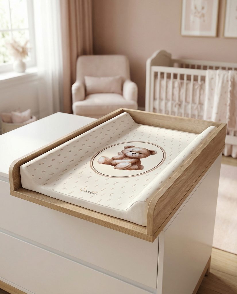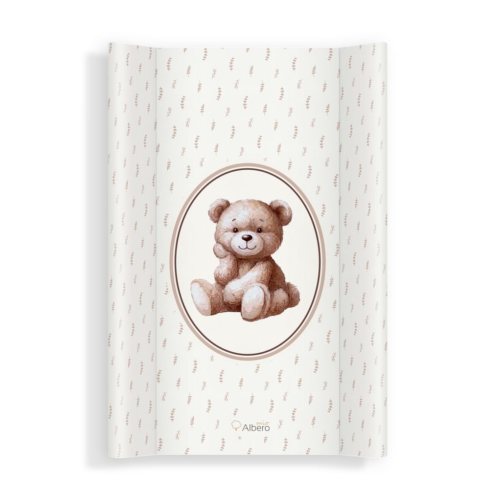 Profilovaná, měkká přebalovací podložka o rozměru 70x47cm značky Albero Mio - design (CM1) Vintage Teddy: určená k umístění na přebalovací komody, pulty, stoly (tj. na pevné a stabilní podklady), 2-hranná profilovaná (2 zvýšené boční hrany), měkká výplň z polyuretanové pěny, povrch z bezpečné PVC…