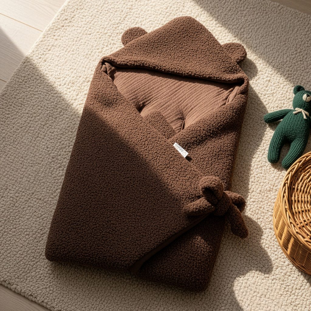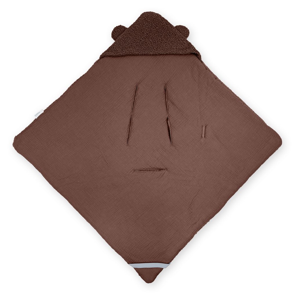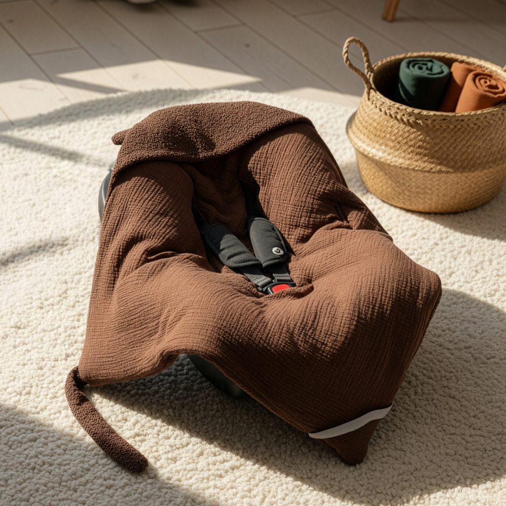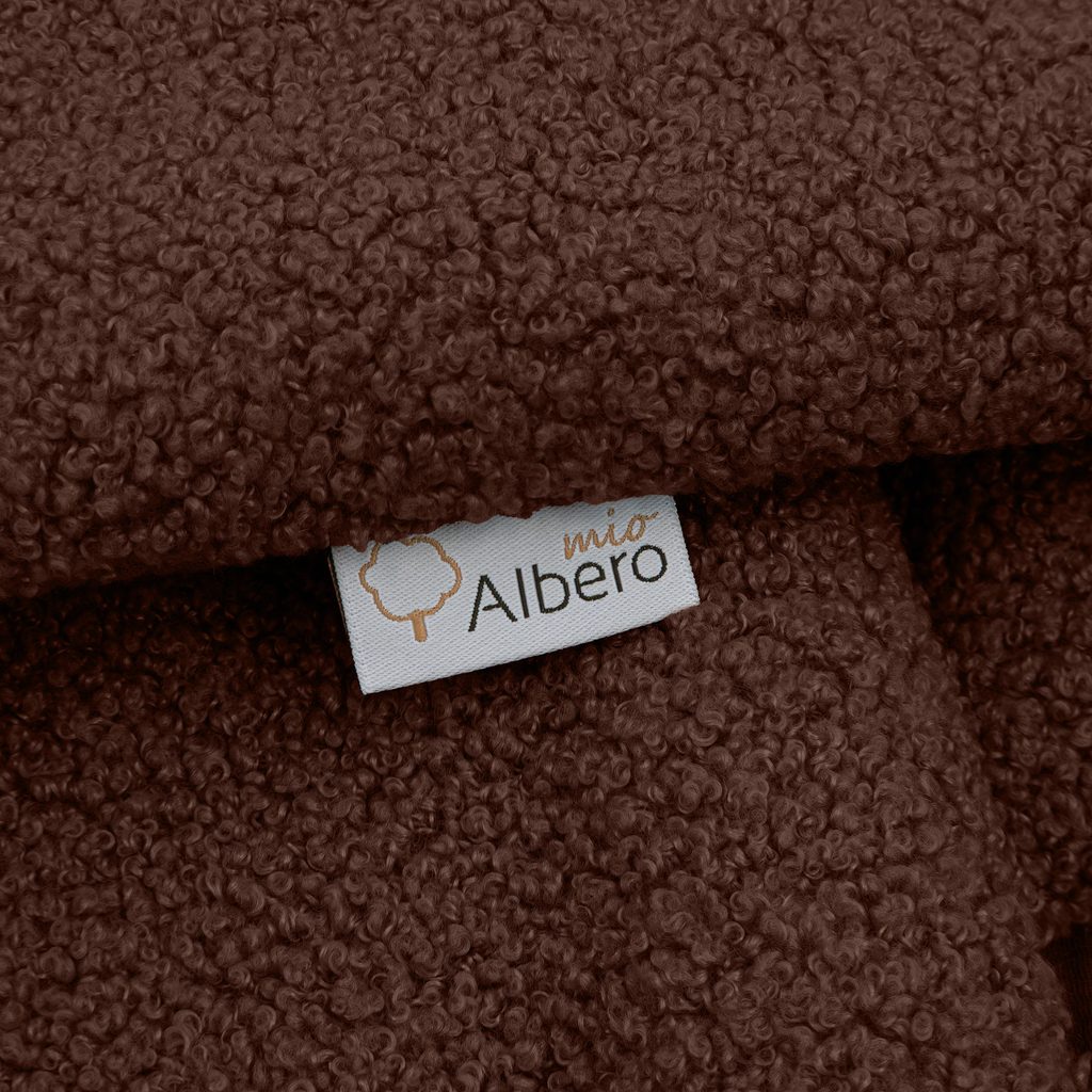 Zavinovačka / deka do autosedačky Boucle značky Albero Mio v ČOKOLÁDOVĚ HNĚDÉ barvě: vhodná pro období jaro/podzim/zima, pro autosedačky typu "vajíčko" (0-13kg), pro 3 i 5 bodové bezpečnostní pásy, zavazovací na mašli, vnější strana trendy látka s beránkovou strukturou buklé (bouclé), spodní…