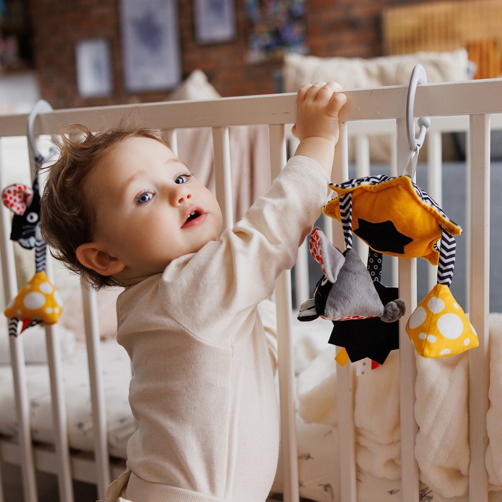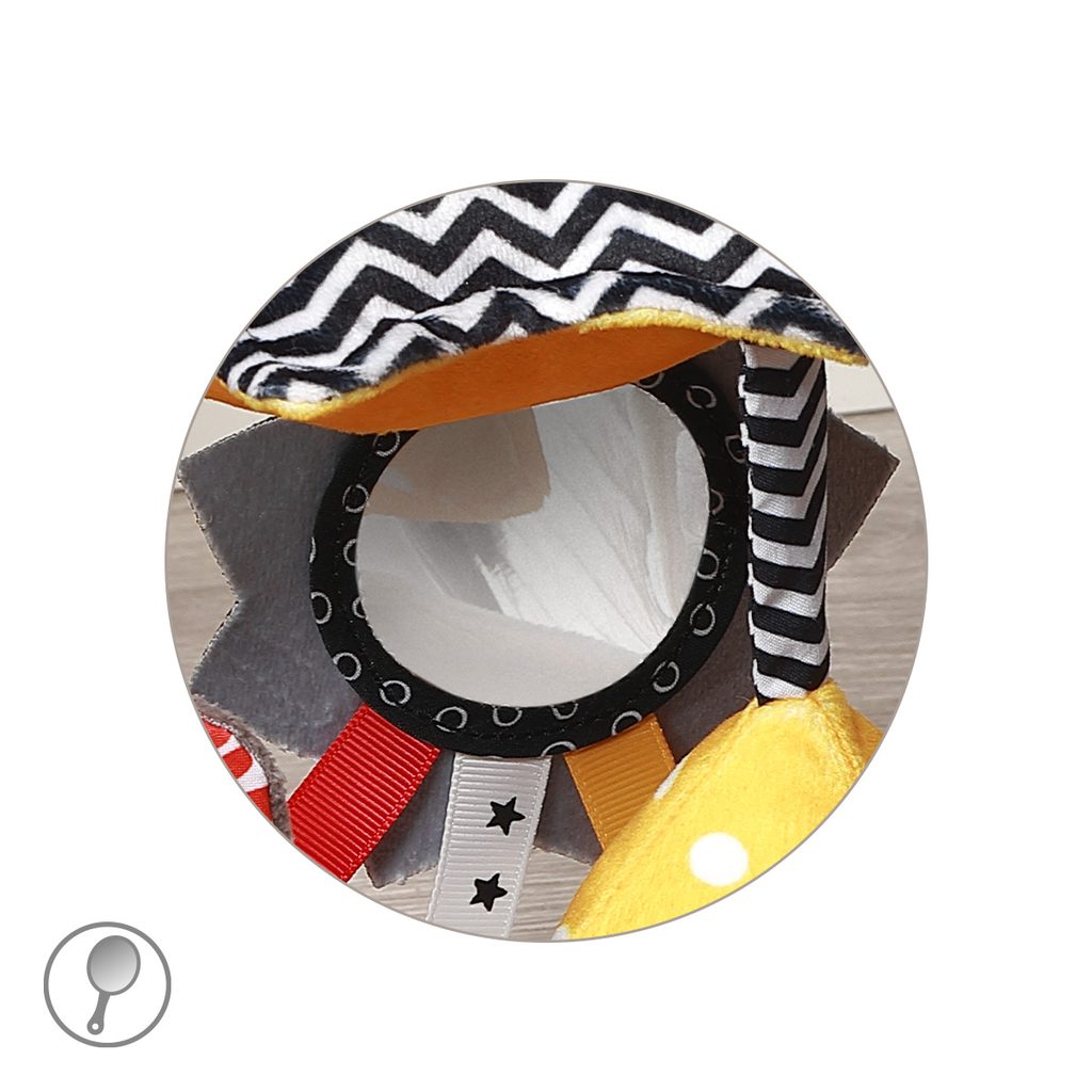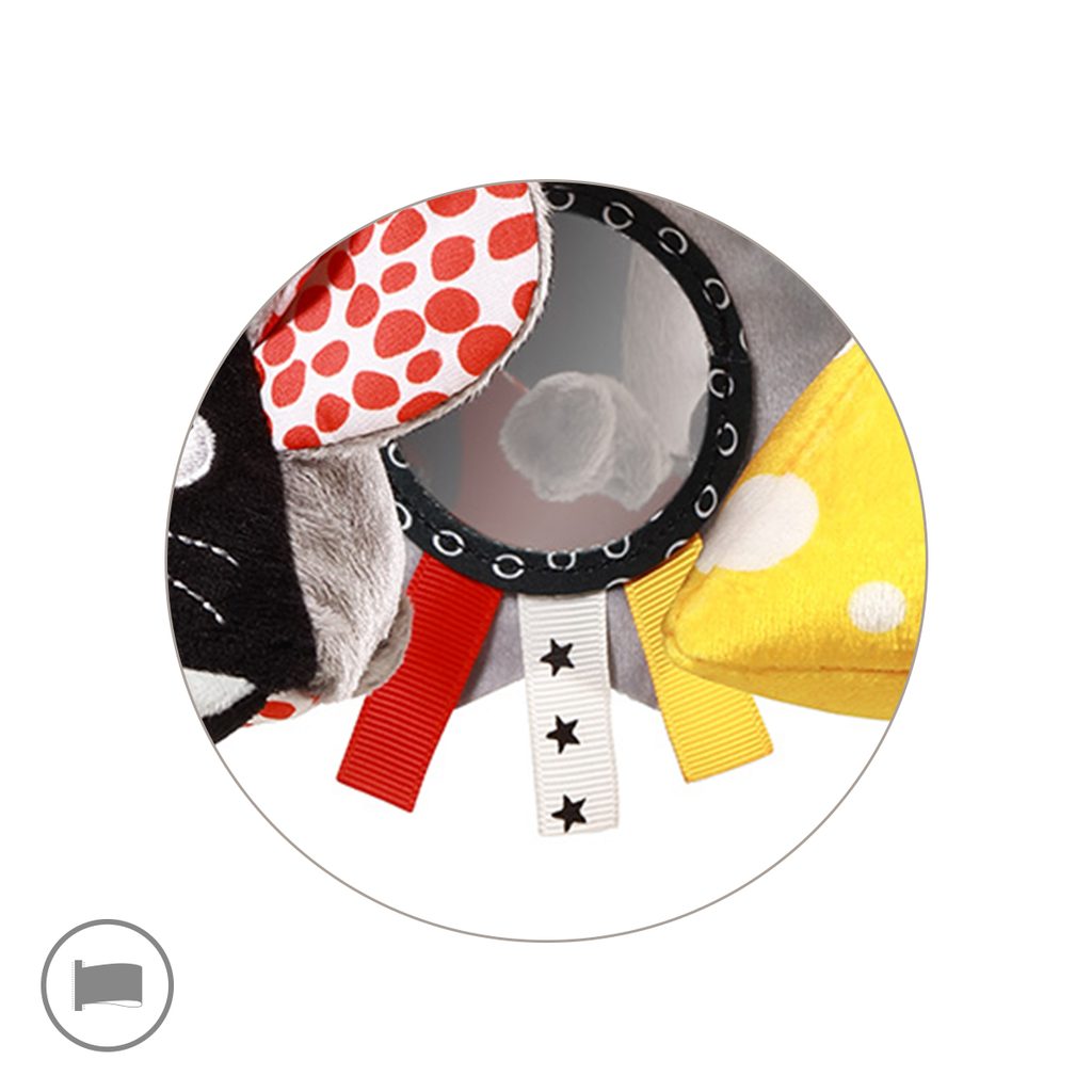 Kontrastní závěsná hračka se zrcátkem MYŠKA značky BabyOno: s dvěma různými chrastítky, senzorickými stužkami, šustícím prvkem a bezpečným zrcátkem,  díky úchytovému kroužku ji jednoduše připevníte ke kočárku nebo postýlku, podporuje rozvoj smyslů (zrak, sluch, hmat) a jemné motoriky, z kombinace…