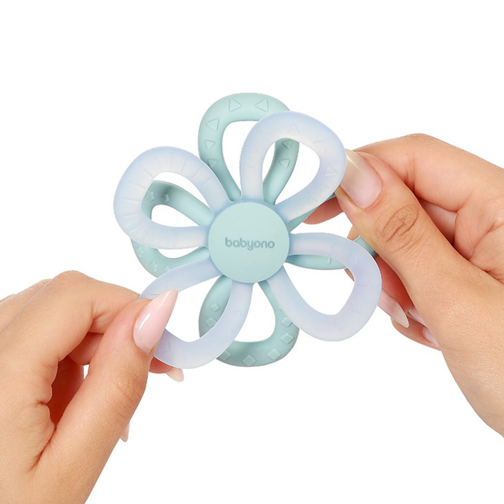 Silikonové kousátko Kytička MODRÁ značky BabyOno: celosilikonové - měkčí materiál, přizpusobuje se dásním a při zkousnutí maximálně přiléhá, s 3D výstupky, které masírují dětské dásně a pomáhají tišit podrážděné dásně, rozvoj motoriky - nácvik úchopu do ruky, navrženo pro snadný úchop malou ručkou…