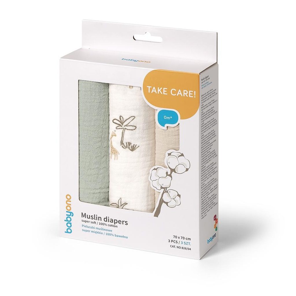 Sada 3ks mušelínových plen značky BabyOno - set SAFARI ZVÍŘÁTKA je laděný do zelena: obsahuje 2x plenu jednobarevnou a 1x vzorovanou, měkké a jemné,  prodyšné a nadýchané, balené v krabičce, rozměr plen 70x70cm. Materiál: 100% bavlna.
