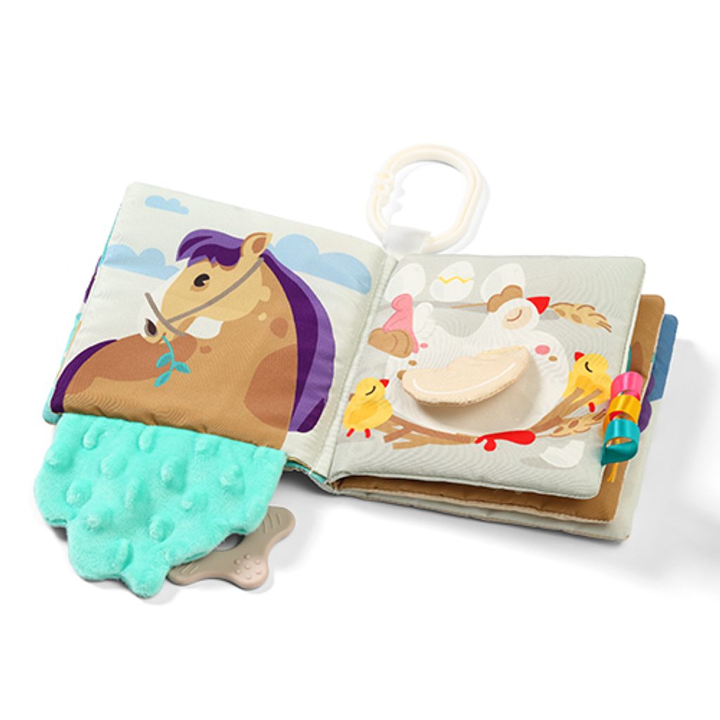 Senzorická látková knížka FARMA značky BabyOno: obrázky s tématikou ze života na farmě, součástí: pískátko, kousátko, šustítko, senzorická poutka a uzlík, "C" spona pro zavěšení, procvičuje úchop, rozvíjí zrakovo-sluchovou koordinaci, je velmi lehká - dobře se drží i v malých ručkách, certifikace…