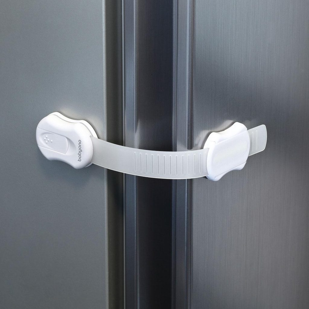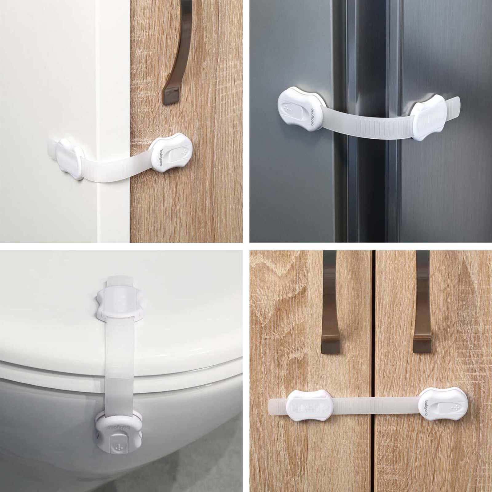 Univerzální zabezpečení s nastavitelnou délkou (4ks) značky BabyOno: nastavitelná délka spojovacího "řemínku", lze používat na rovné ploše i přes roh, vhodné pro skříně, skříně, zásuvky, vitríny, toalety, ledničky, instalace možná na různé materiály (dřevo, plast, sklo), …
