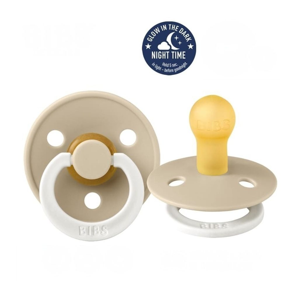 Dudlík s kulatou savičkou z přírodního kaučuku kultovní dánské značky BIBS z kolekce Colour. Verze NIGHT - s ve tmě svítícím/fosforeskujícím úchytovým kroužkem. Velikost 2 (M) - určená dětem věku 6-18m. V balení 1ks. Barva: VANILLA NIGHT.
