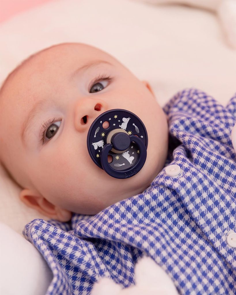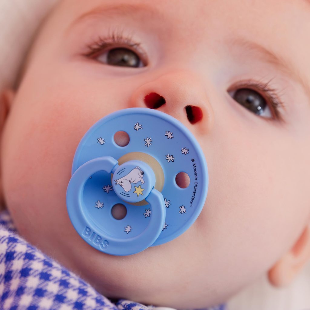 Objevte jedinečné dudlíky BIBS Moomin s ikonickými pohádkovými postavičkami mumínků. Dudlíky pro děti 0-6m (velikost 1) s kulatou savičkou z přírodního kaučuku. Design: Good Night Breeze Mix.