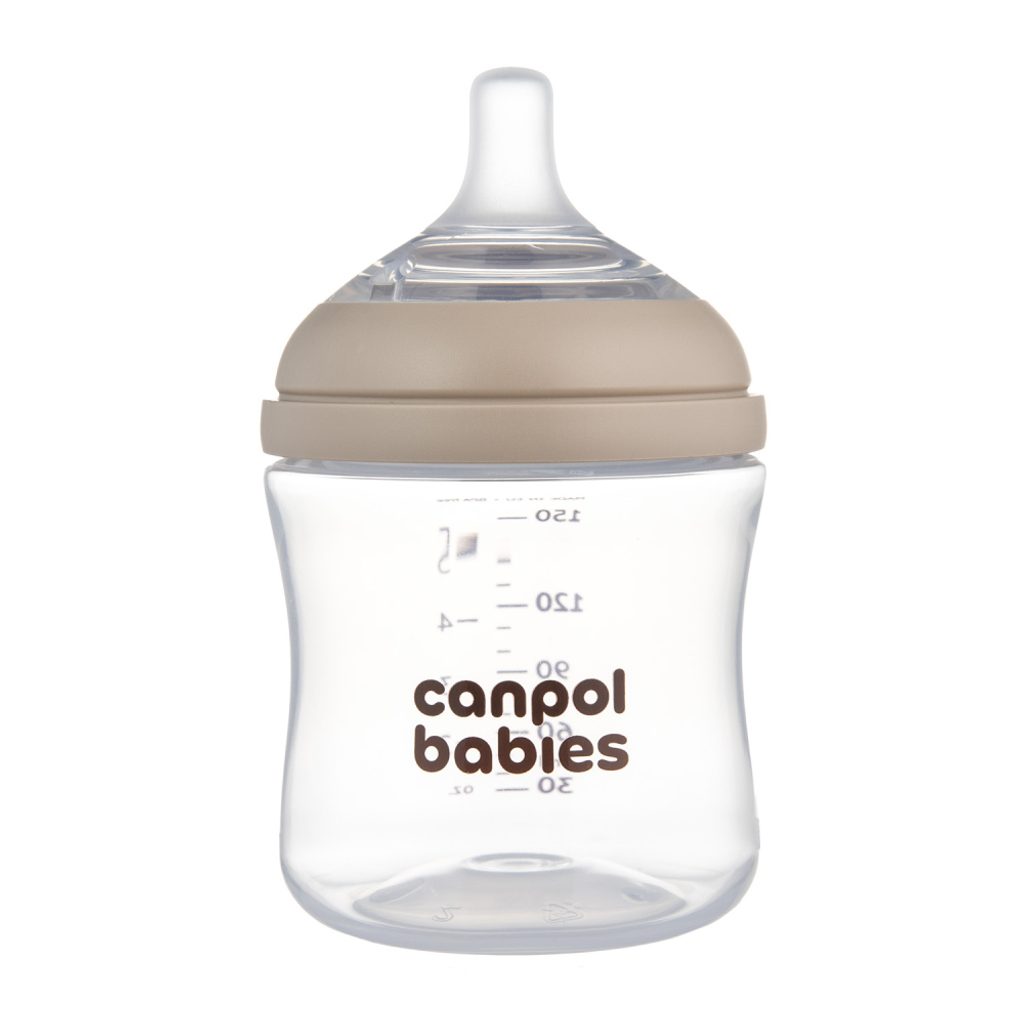 Kojenecká láhev se širokým hrdlem řady Natural Shape značky Canpol babies o objemu 150ml. Osazená dvouzónovou savičkou s pomalým průtokem (0m+, newborn mini).