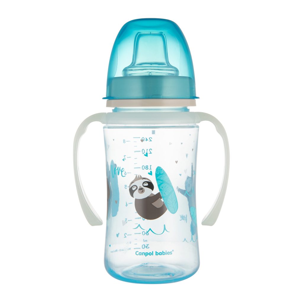 Tréninkový hrníček se silikonovým pítkem a svítícími úchyty značky Canpol babies z řady EasyStart, kolekce Exotic Animals - barva MODRÁ s obrázkem LENOCHODA. Určený dětem 6m+.