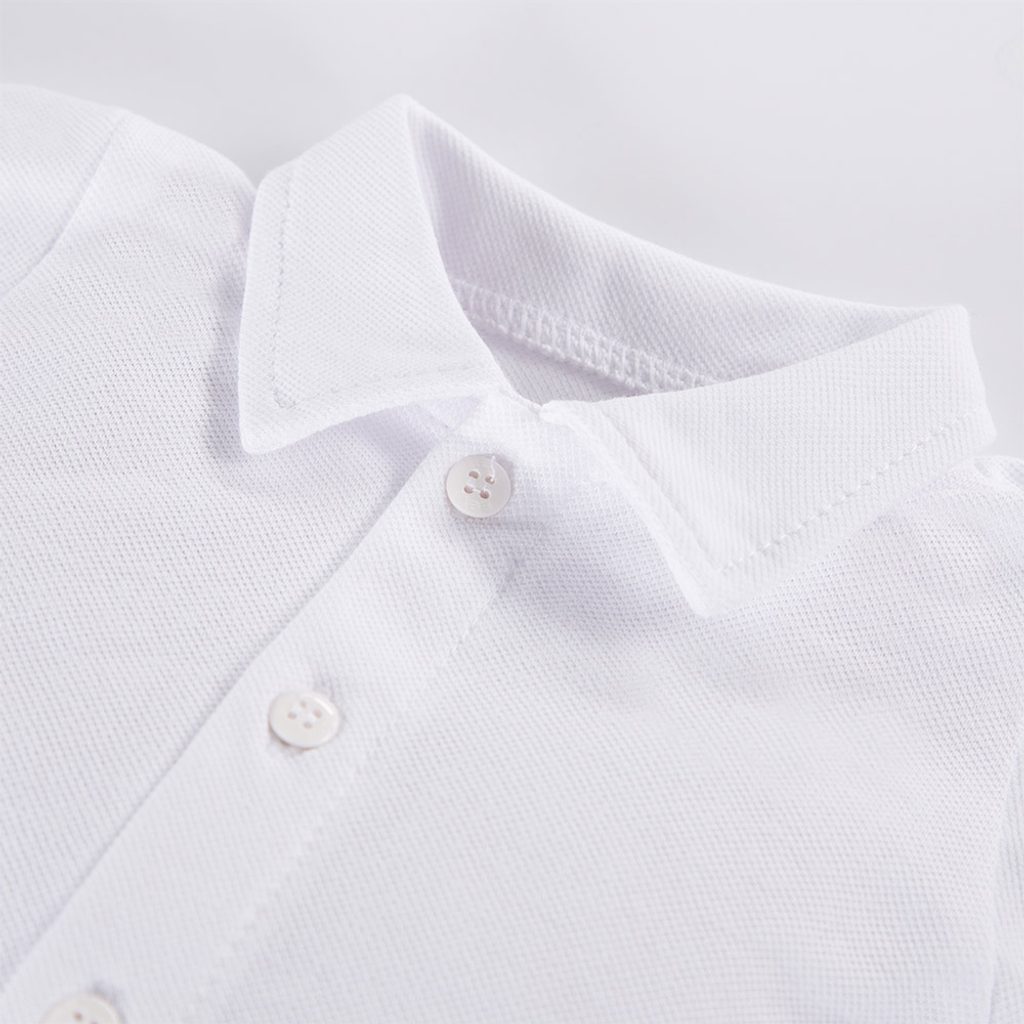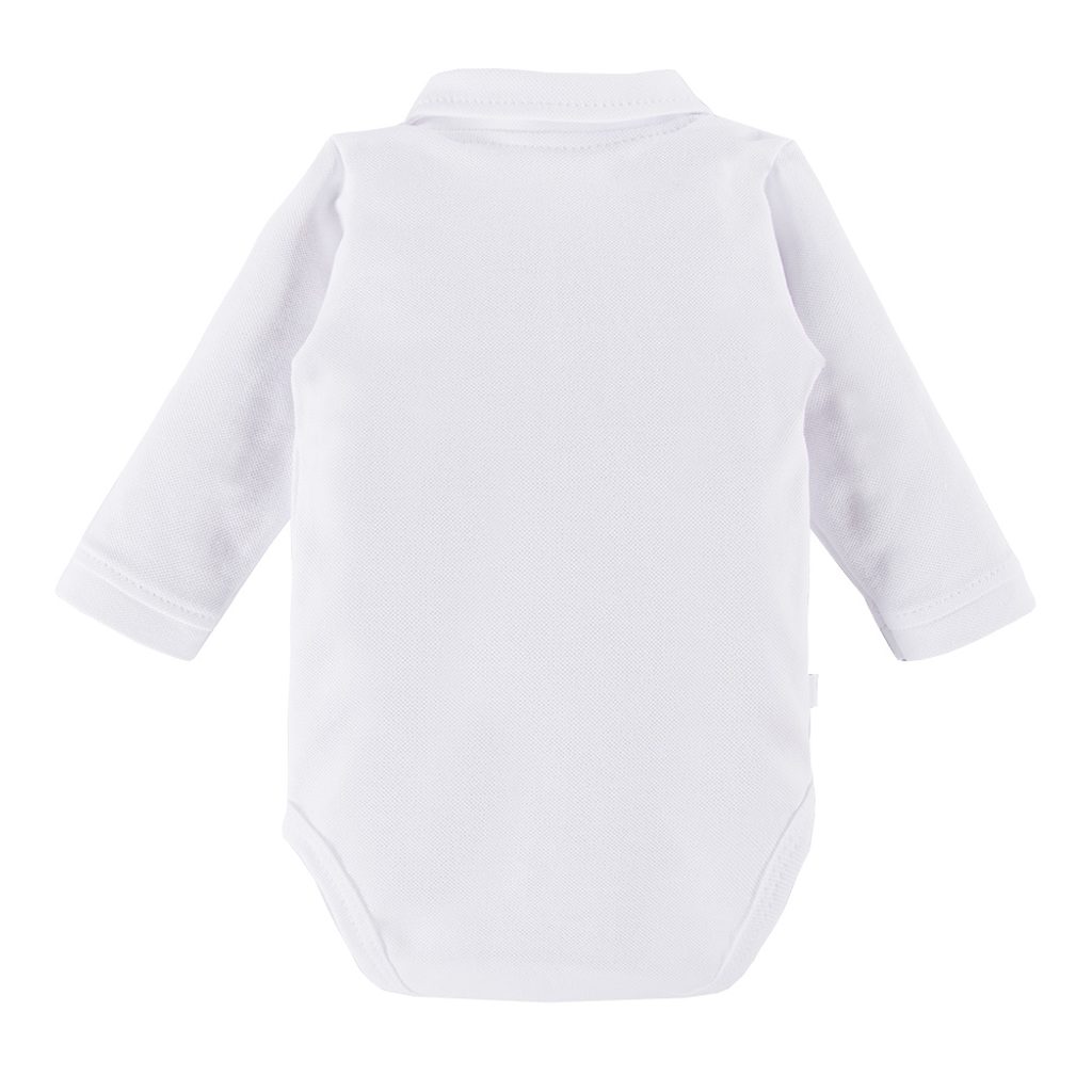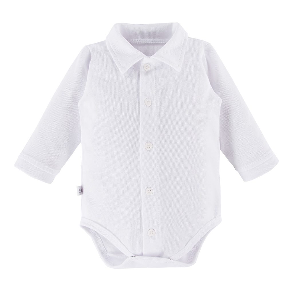 Body košile s dlouhým rukávem z kolekce Ceremony značky Eevi - barva bílá: zapínání na knoflíčky a mezi nožkama na druky, s elegantním límečkem, bavlněný úplet typu lacosta (100% bavlna), vyrobeno v EU. Slaďte s dalšími kousky oblečení z kolekce Ceremony značky Eevi!