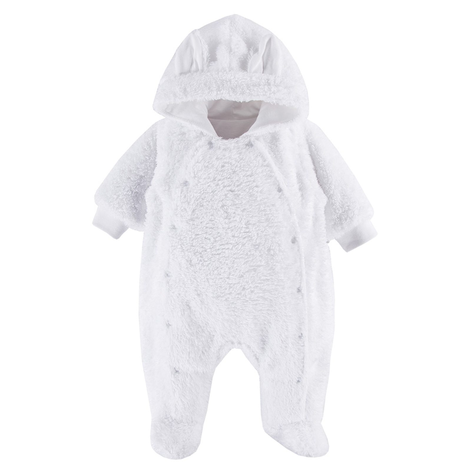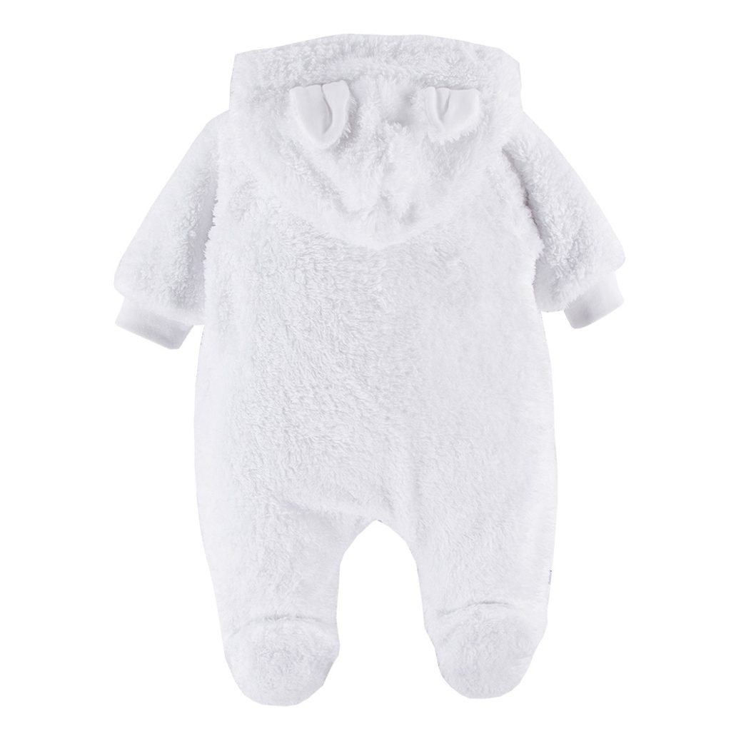 Chlupatý kojenecký overal s kapucí / kombinéza pro miminko značky Eevi z kolekce Mellow - barva BÍLÁ: ideální na jaro/podzim nebo jako silnější/hřejivější overálek na doma, 2-vrstvý - povrch z chlupatého plyše, podšívka z bavlněného jersey úpletu, oboustranné rozepínání přední části (patentky)…