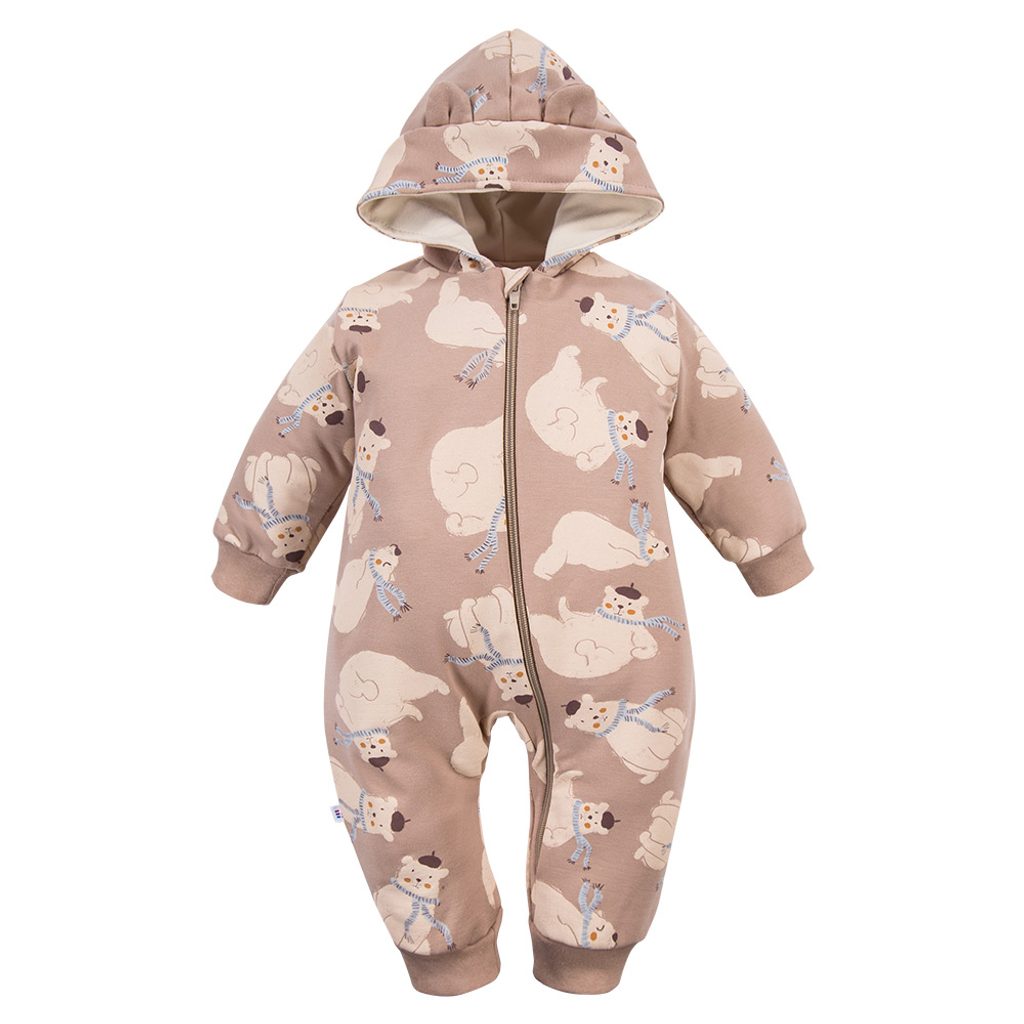 Dětská kombinéza/overal z teplákoviny značky Eevi z kolekce Beary Cool - vzorovaná BÉŽOVÁ, s potiskem medvídků: