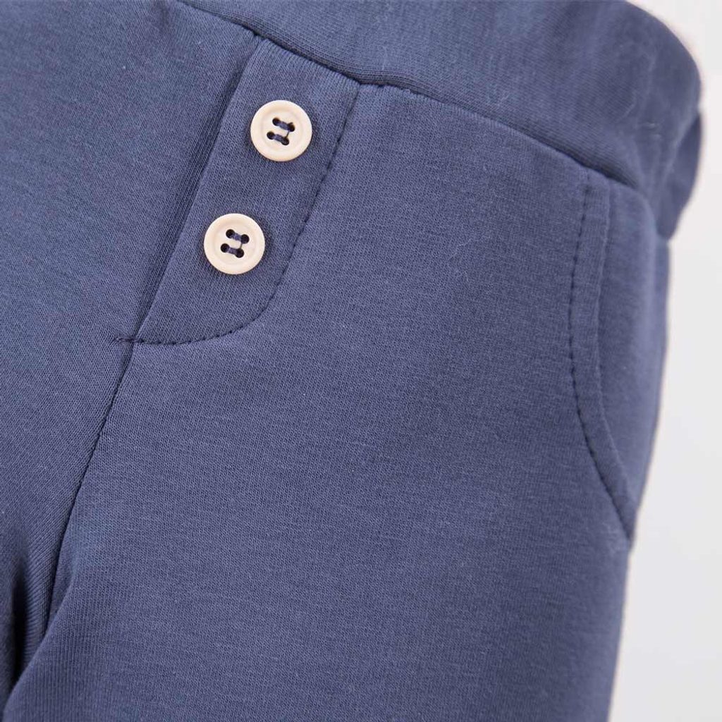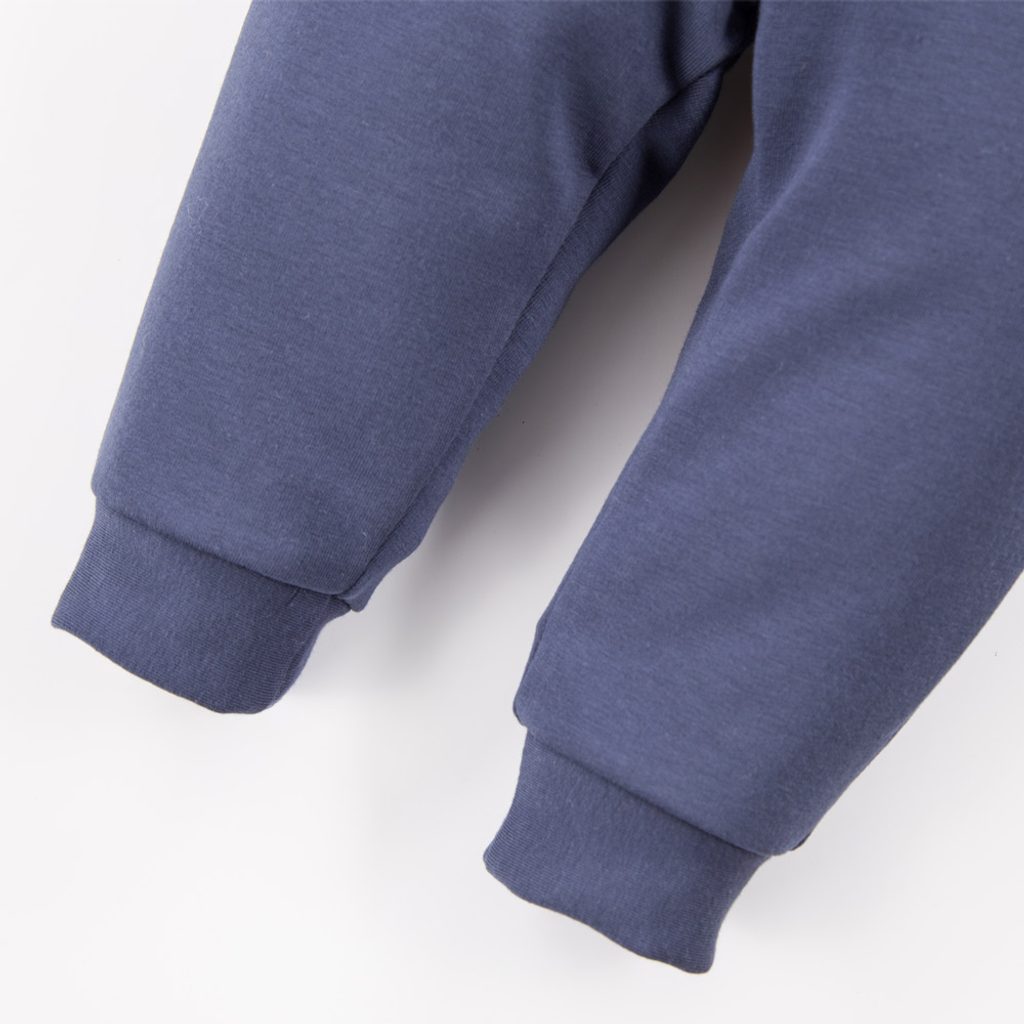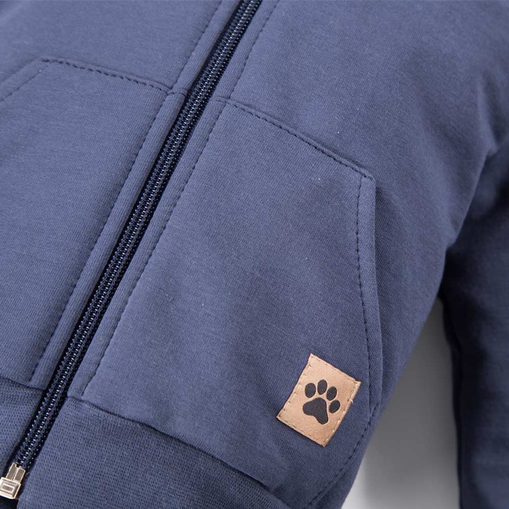Tepláková souprava pro nejmenší z kolekce Puppy Playtime značky Eevi v tmavě modré barvě: mikina na zip s odepínací kapucí, kapuca s roztomilými oušky, kontrastní podšívka kapuci se vzorem pejsků, u krku ochranné překrytí zipu, tepláčky s funkčními kapsami, v pase do gumy, vpředu v pase našité…