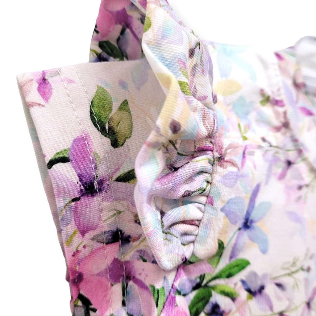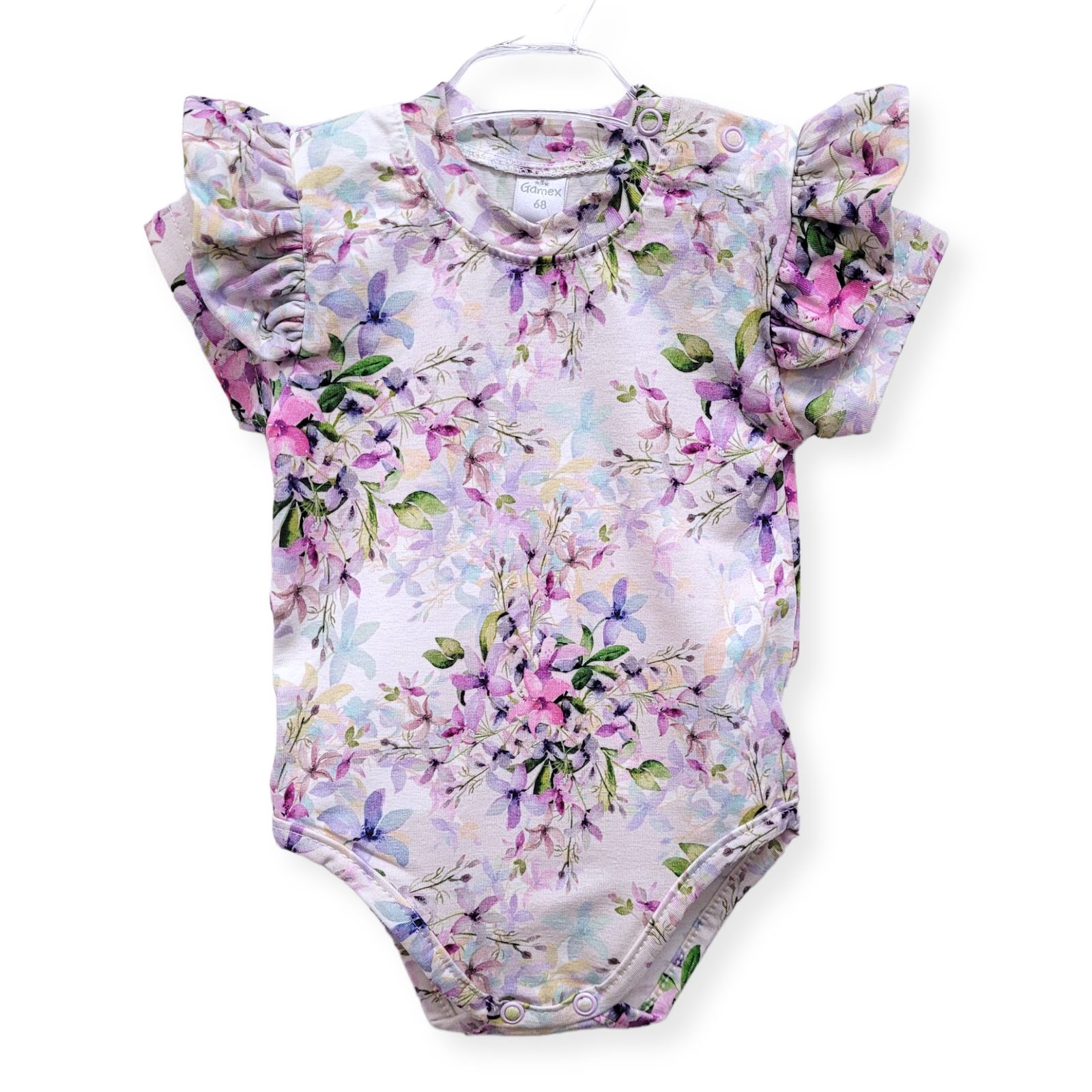Body s krátkým rukávem značky Gamex vzor FIALOVÉ KVĚTY na krémovo-šedém podkladu: