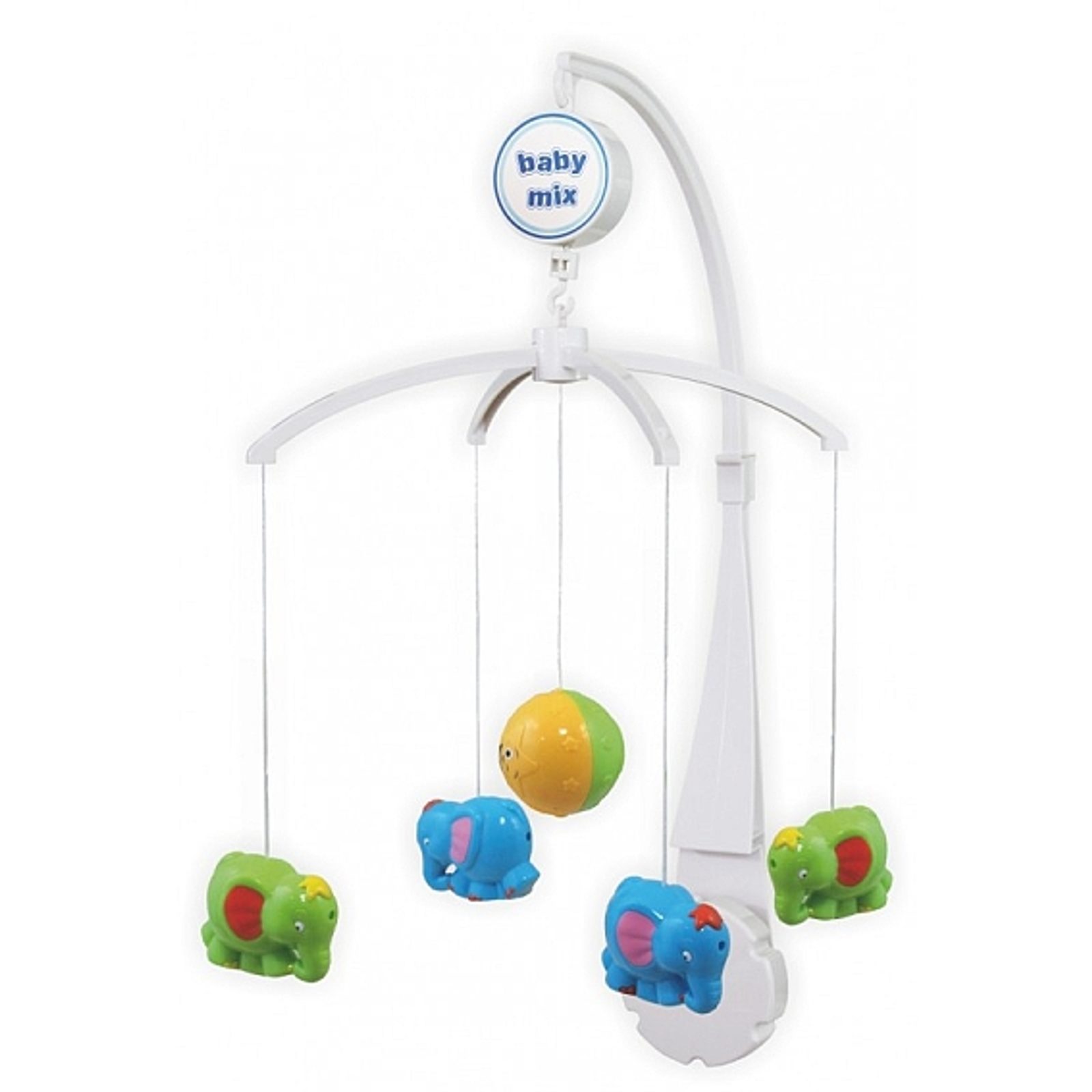 Hudební kolotoč nad postýlku plastový SLONI značky Baby Mix je určen k umístění na dětskou postýlku. Hudební kolotoč hraje po natažení mechanického hracího strojku melodii, která pomáhá dítě uspat. Na ramenou hudebního kolotoče jsou umístěny roztomilé pestrobarevné plastové hračky, které poutají pozornost miminka a pomáhají stimulovat rozvoj jeho zraku. Zároveň se spuštěním hracího strojku se ramena kolotoče s hračkami otáčejí kolem své středové osy. Hrací strojek hudebního kolotoče je vybaven brzdou hudebního strojku - která slouží k zastavení (pauze) hracího strojku v době jeho natahování.