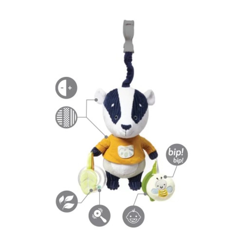 Plyšová edukační závěsná hračka do autosedačky nebo kočárku značky BabyOno z kolekce Play More - design Jezevec Edmund. vyrobena z kombinace kvalitních materiálů (jemný plyš, hladká bavlna, manžestr), s kousátkem, pískátkem, chrastítkem, klipem pro připevnění a šustícími prvky, rozvíjí…