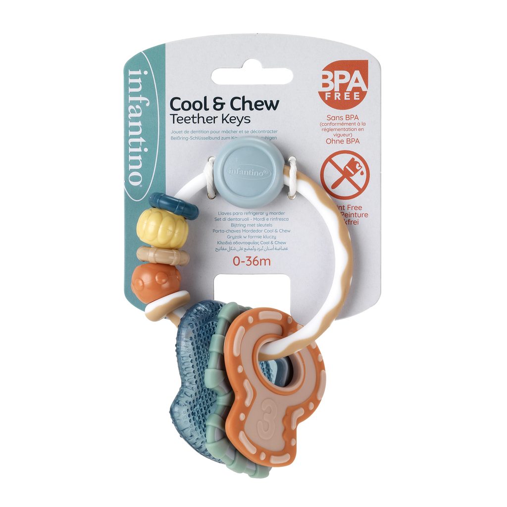 Chrastítko s kousátky Klíčky značky Infantino: v podobě kroužku s posuvnými korálky a klíčky, které slouží i jako kousátka pro úlevu při prořezávání prvních zoubků, kousátka mají různé povrchy (měkčí i pevnější) a je možné je ochladit v lednici pro větší úlevu při růstu zoubků, při pohybu jemně…