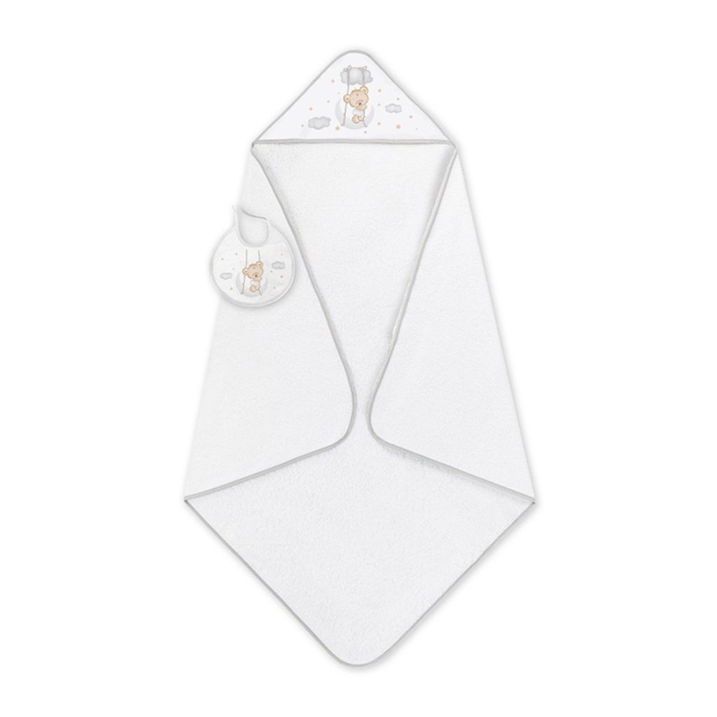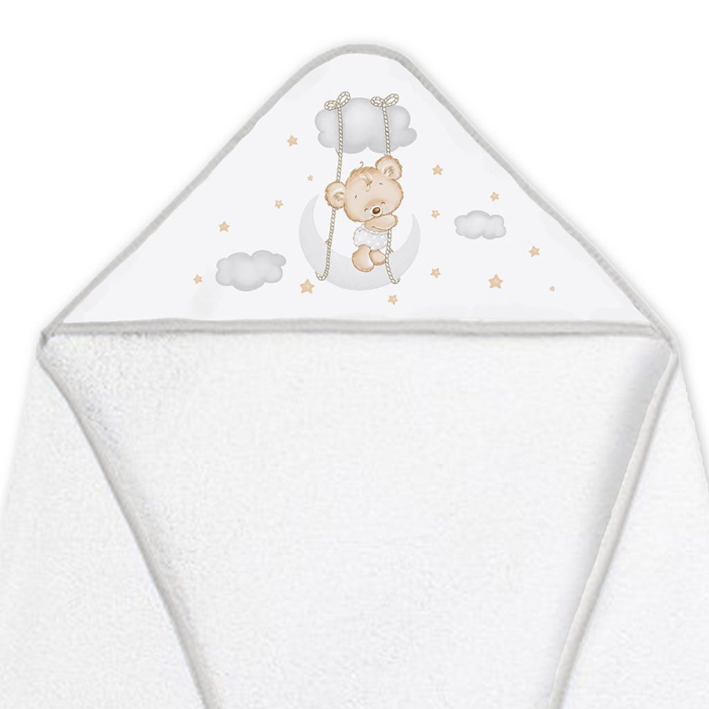 Froté osuška s kapucí + bryndák španělské značky Interbaby - design Medvídek na houpačce BÍLO-ŠEDÁ. větší rozměr 100x100cm - poslouží od miminka do 3let, z kvalitního, hustého froté (100% bavlna), skvěle saje a zahřeje po koupeli, jemná k dětské pokožce, s veselým obrázkem na kapuci, bryndák s…