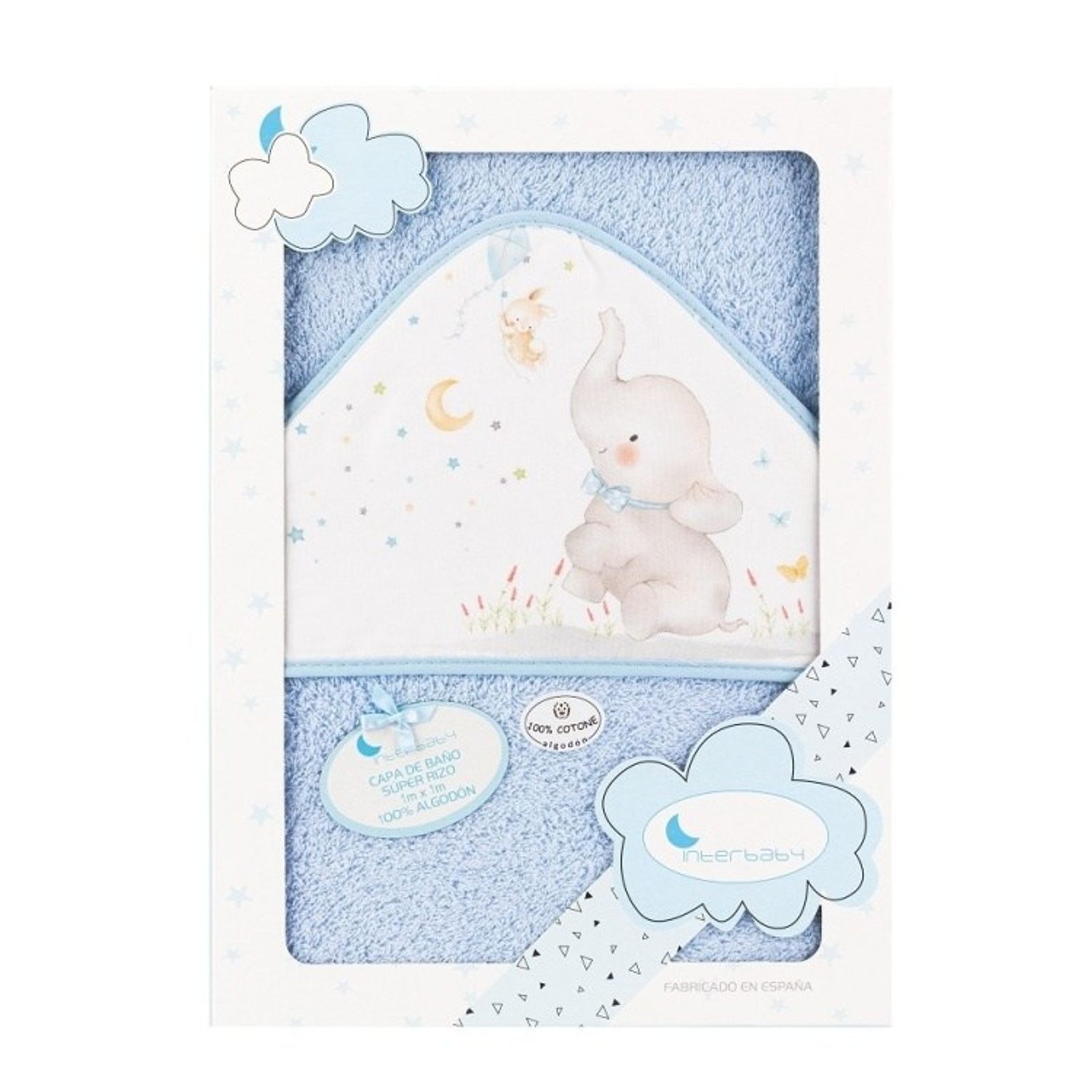 Froté osuška s kapucí španělské značky Interbaby - design SLON MODRÁ. větší rozměr 100x100cm - poslouží od miminka do 3let, z kvalitního, hustého froté (100% bavlna), skvěle saje a zahřeje po koupeli, jemná k dětské pokožce, s veselým obrázkem na kapuci, balena v dárkové…