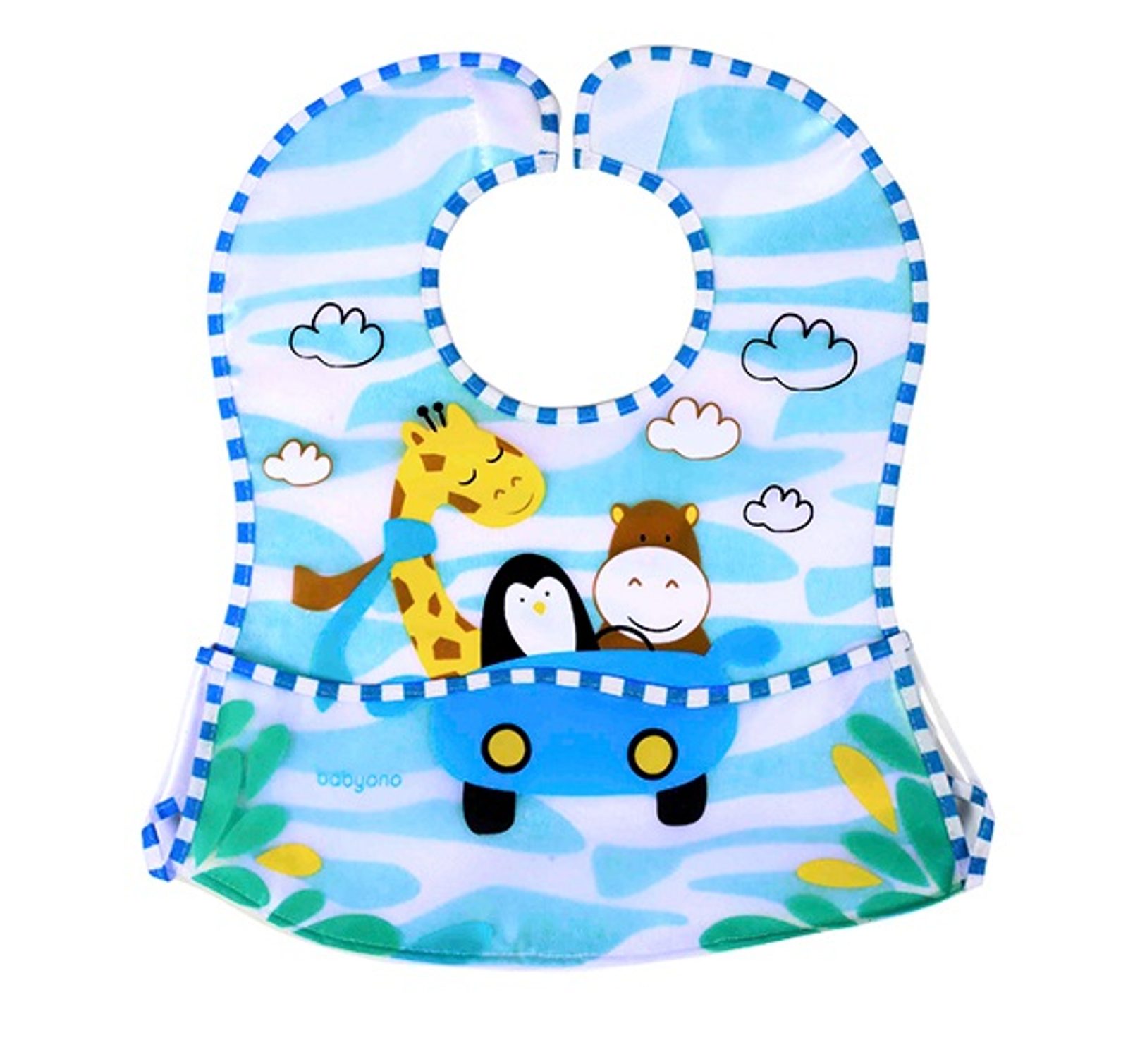 BabyOno Omyvatelný bryndák s kapsou "klokan" s veselým obrázkovým motivem ZVÍŘÁTKA V AUTĚ, ochrání oblečení Vašeho mrňouska před ušpiněním v průběhu jídla.