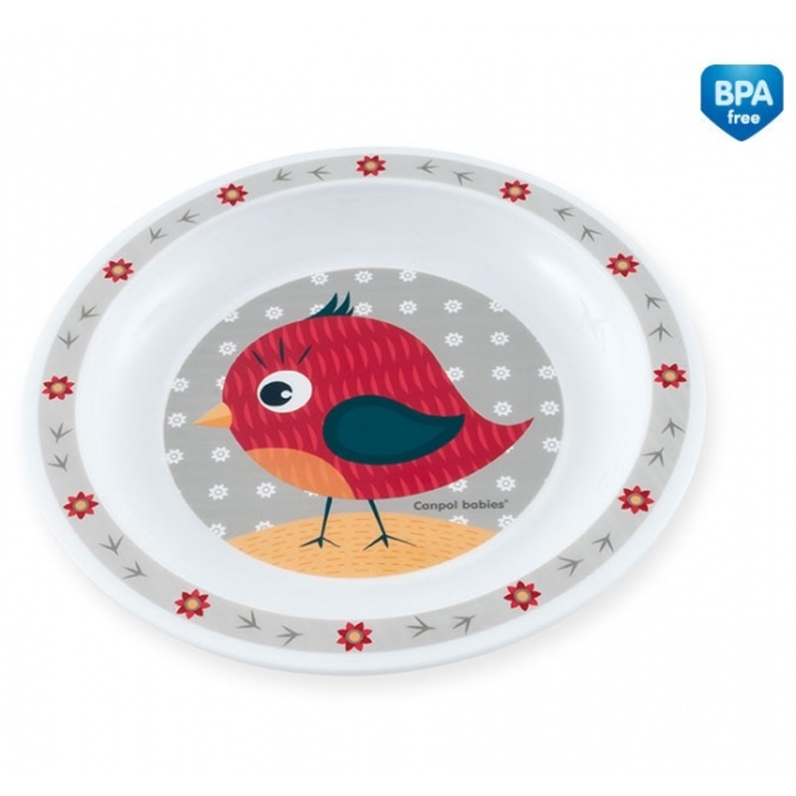 Dětský plastový talíř značky Canpol babies z kolekce Cute Animals - design PTÁČEK. Vhodný pro použití jak při krmení dítěte dospělou osobou, tak i posléze k nauce dítěte jíst samostatně.