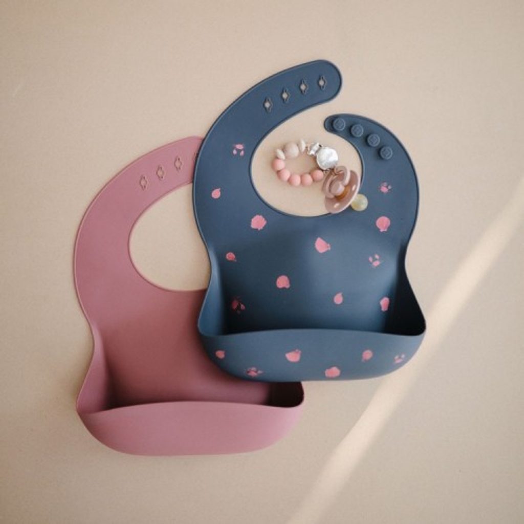 Designový silikonový bryndák s kapsou vzor LILAC FLOWERS od Mushie - je spojením nadčasového minimalismu, prémiové kvality a funkčnosti.