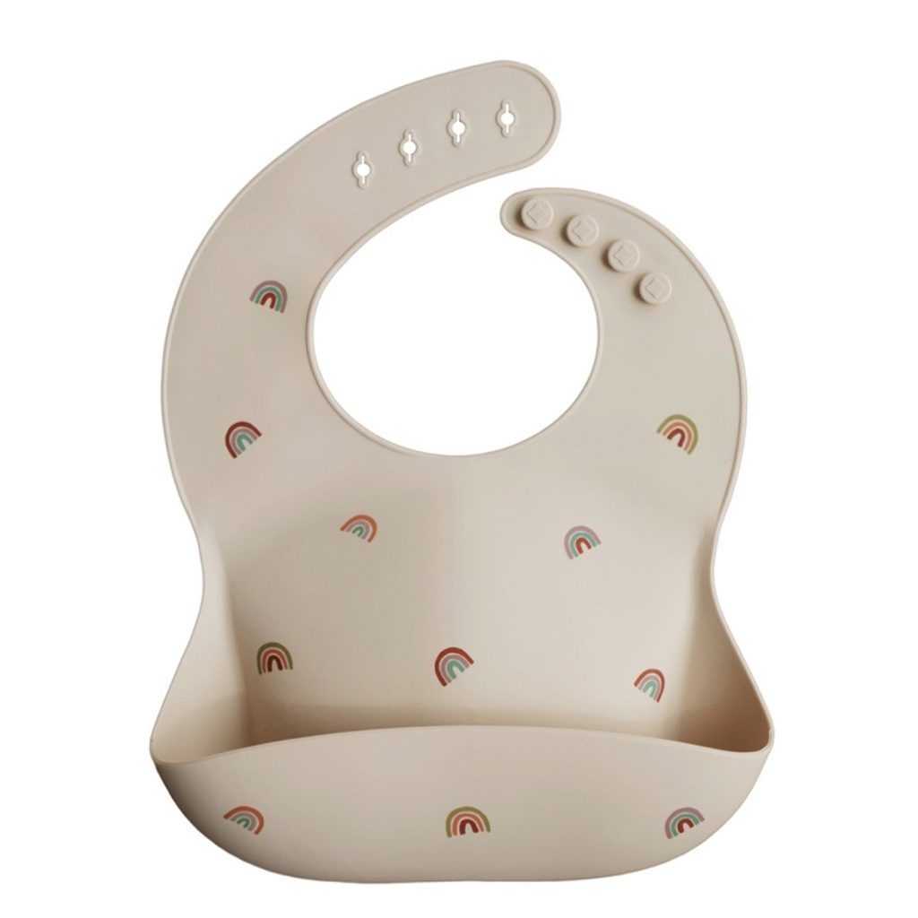 Designový silikonový bryndák s kapsou vzor RAINBOWS od Mushie - je spojením nadčasového minimalismu, prémiové kvality a funkčnosti.