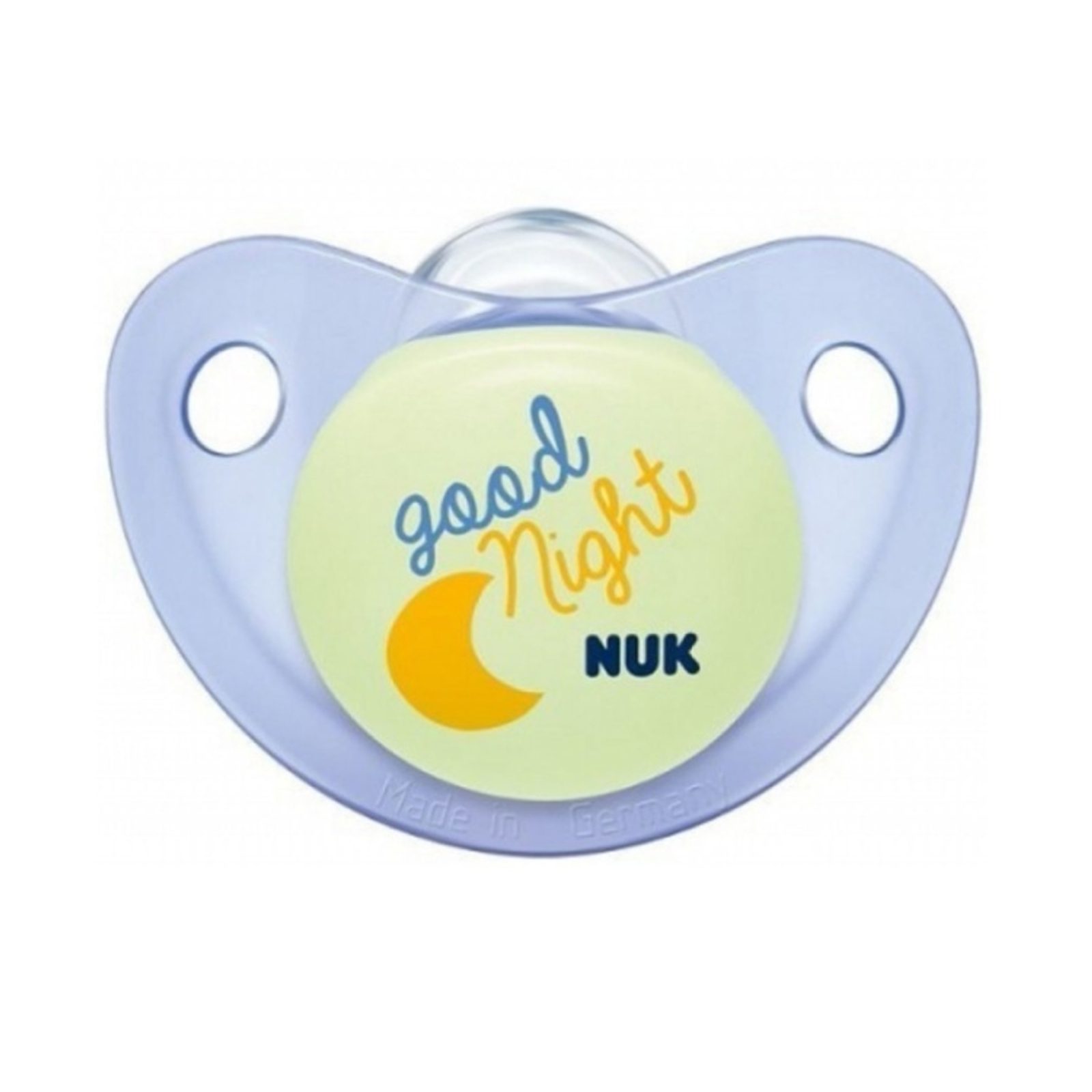 Ve tmě svítící dudlík značky NUK s veselými obrázky kolekce DEN & NOC řady Trendline - s nápisem GOOD NIGHT v modré barevné kombinaci. Tento dudlík je určen dětem věku 0-6 měsíců, má ortodontický tvar sosáčku, který je vyroben ze silikonu.