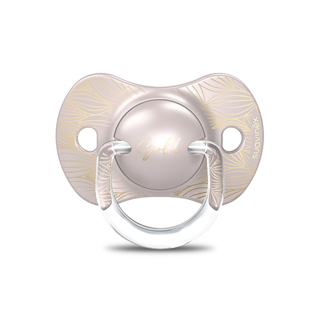 Fyziologický dudlík s inovovaným sosáčkem SX Pro. Z kolekce PREMIUM GOLD, v šedé barevné kombinaci, španělské značky Suavinex. Určený dětem 6-18m.