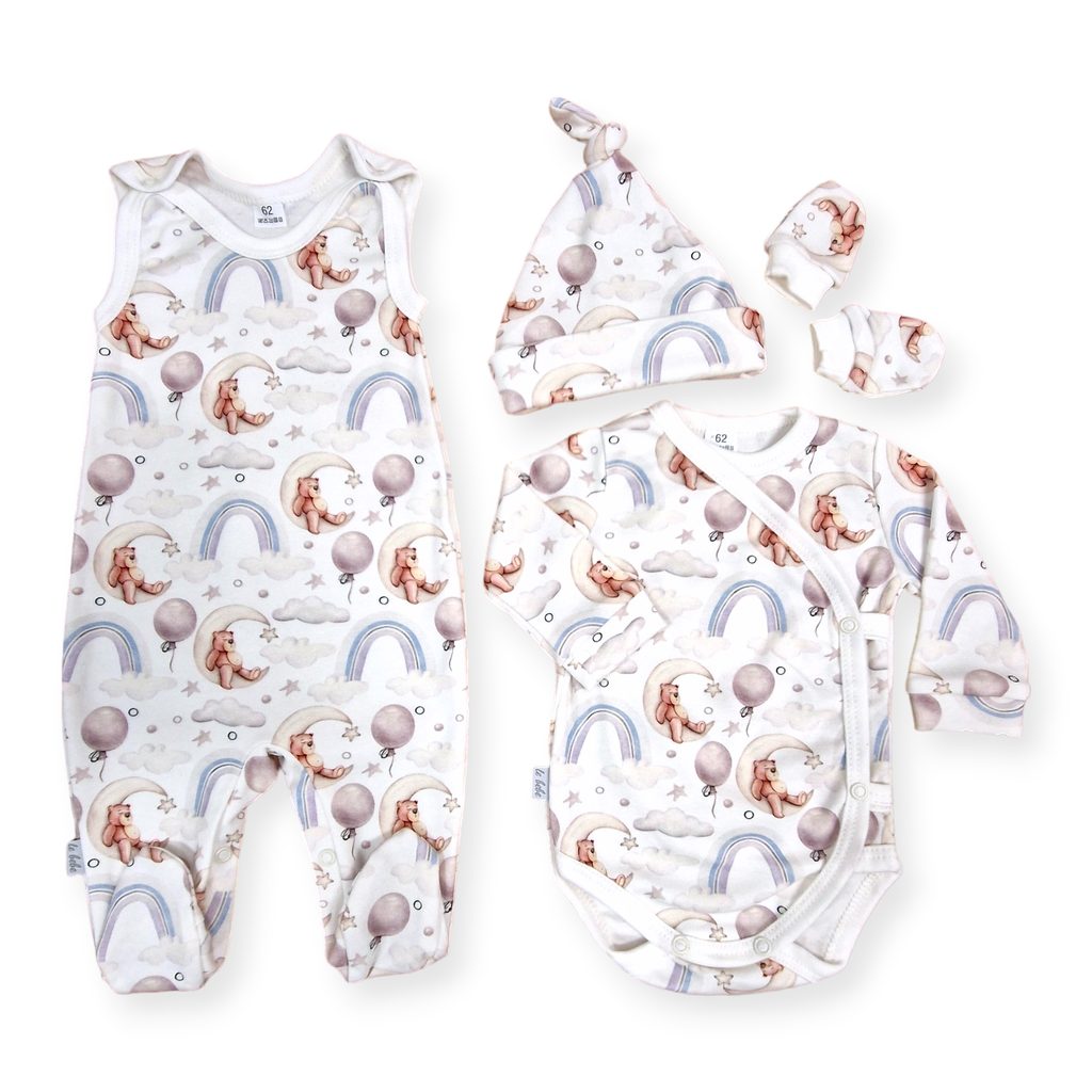 4-dílná soupravička do porodnice značky Le Bebe design Méďa na měsíci - obsahuje desigovně sladěné: dupačky, zavinovací body, čepičku, rukavičky: limitovaná kolekce - vyrobeno exkluzivně pro ProMrňousky.cz, vzor spinkajících medvídků na měsících a obláčků, dupačky se zapínáním na rameni a mezi…