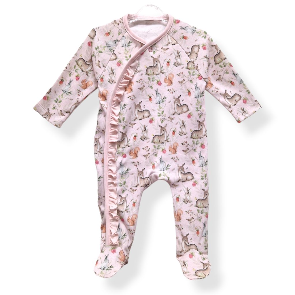 Kojenecký overal  s ozdobným volánkem z kolekce Forest značky Lili Royal Baby - barva RŮŽOVÁ: se vzorem lesních zvířátek (digitální tisk), šikmé zapínání na patentky, měkký a hebký bavlněný jersey úplet, materiál: 100% bavlna, vyrobeno v EU. Orientační rozměry*: vel.56 - délka (rameno-pata) 43cm…