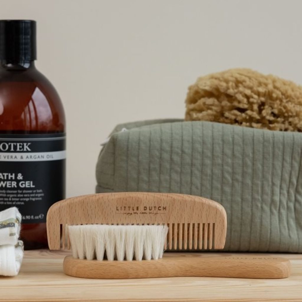 Dětský dřevěný hřeben se širokými zuby a kartáč s měkkými štětinami oblíbené značky Little Dutch. Měkké štětiny kartáče jemně masírují pokožku hlavy a podporují prokrvení. Hřeben se širokými zuby pomáhá vlasy snadno rozčesat a upravit. Ideální pro každodenní rituál po koupeli nebo před spaním.…