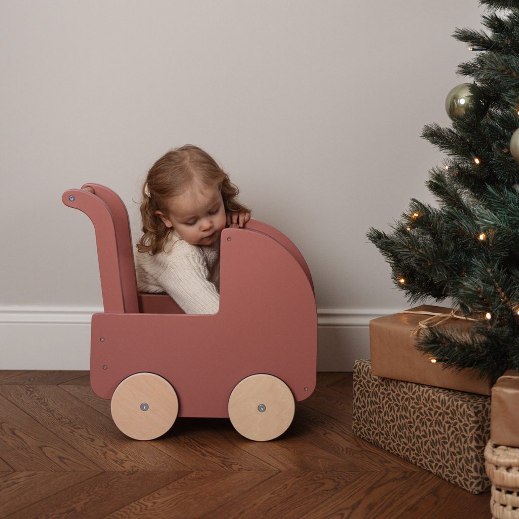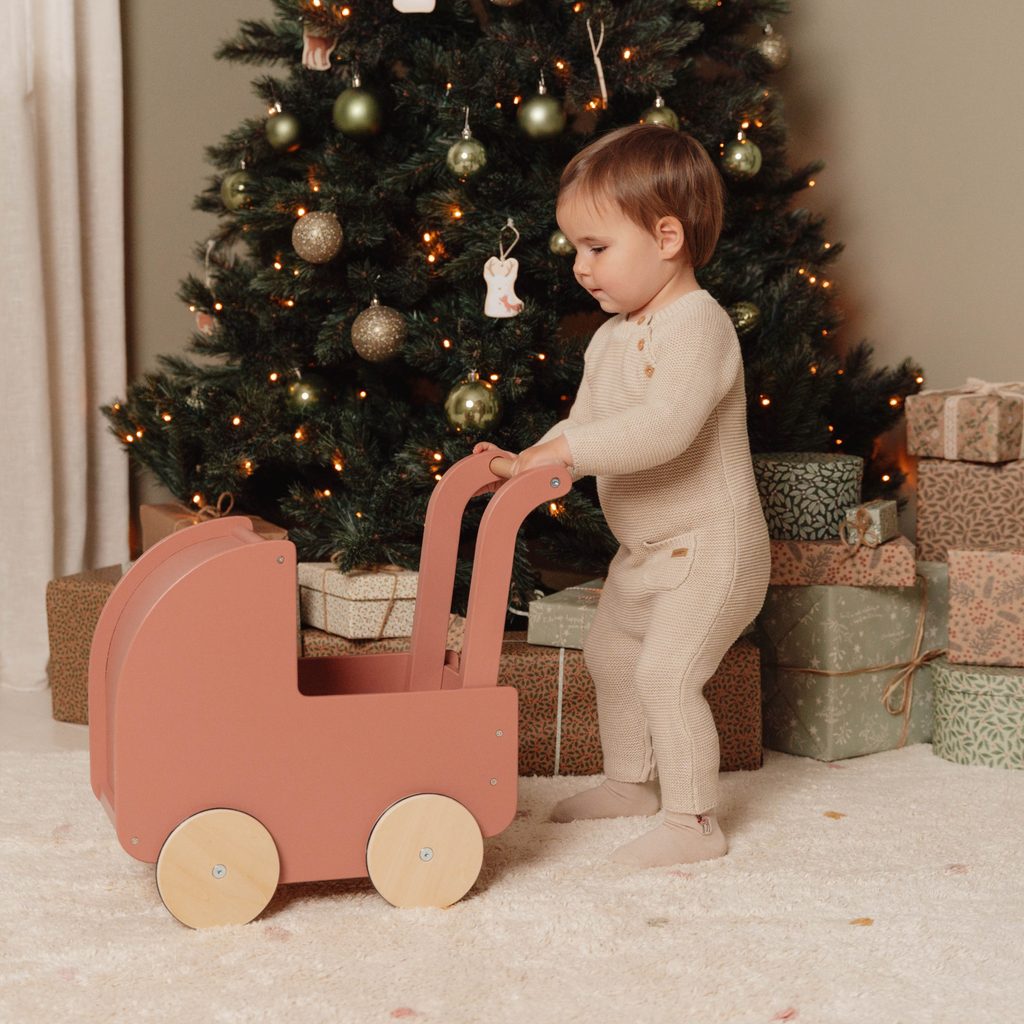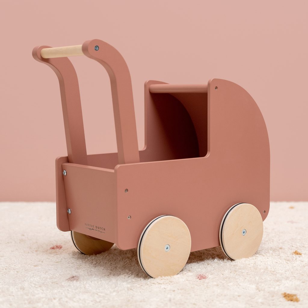 Dřevěný kočárek pro panenky s peřinkou, polštářkem a matrací z kolekce Květiny a motýli holandské značky Little Dutch, jistě potěší každou malou slečnu!