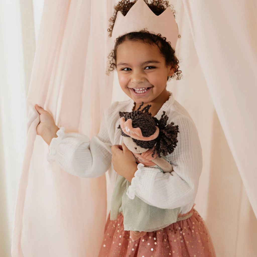 Roztomilá látková panenka princezna Evi z nové kolekce nizozemské značky Little Dutch. Nerozlučná kamarádka pro každodenní dobrodružství, pohádkové snění a klidné usínání. Má krásné kudrnaté vlásky, šaty s květinovou výšivkou a milý vzhled kterým si získá vaše srdce.