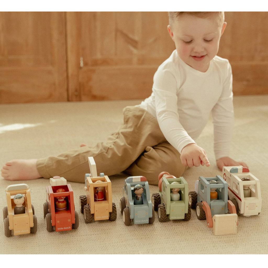 Dřevěné policejní auto Little Dutch je připraveno vyrazit do akce, když je potřeba zasáhnout. S figurkou policisty (která je součástí) mohou děti vytvářet napínavé příběhy, chytat zloděje nebo hlídat pořádek ve městě. Hra s policejním autem rozvíjí dětskou fantazii, motoriku i zájem o svět kolem sebe.