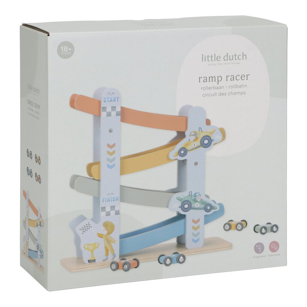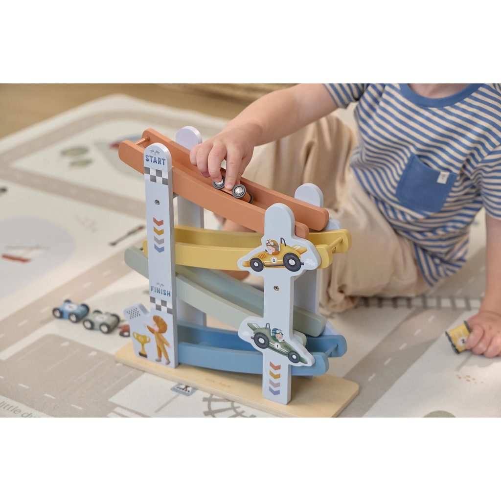 Dřevěná závodní dráha v modrém provedení, holandské značky Little Dutch. podporuje rozvoj motoriky a dětské fantazie, obsahuje: závodní dráhu (4-patrovou) + 4 autíčka díky kvalitnímu dřevěnému provedení je dráha velmi stabilní a stane se i krásnou dekorací v dětském pokoji  Vyrobeno z odolného…