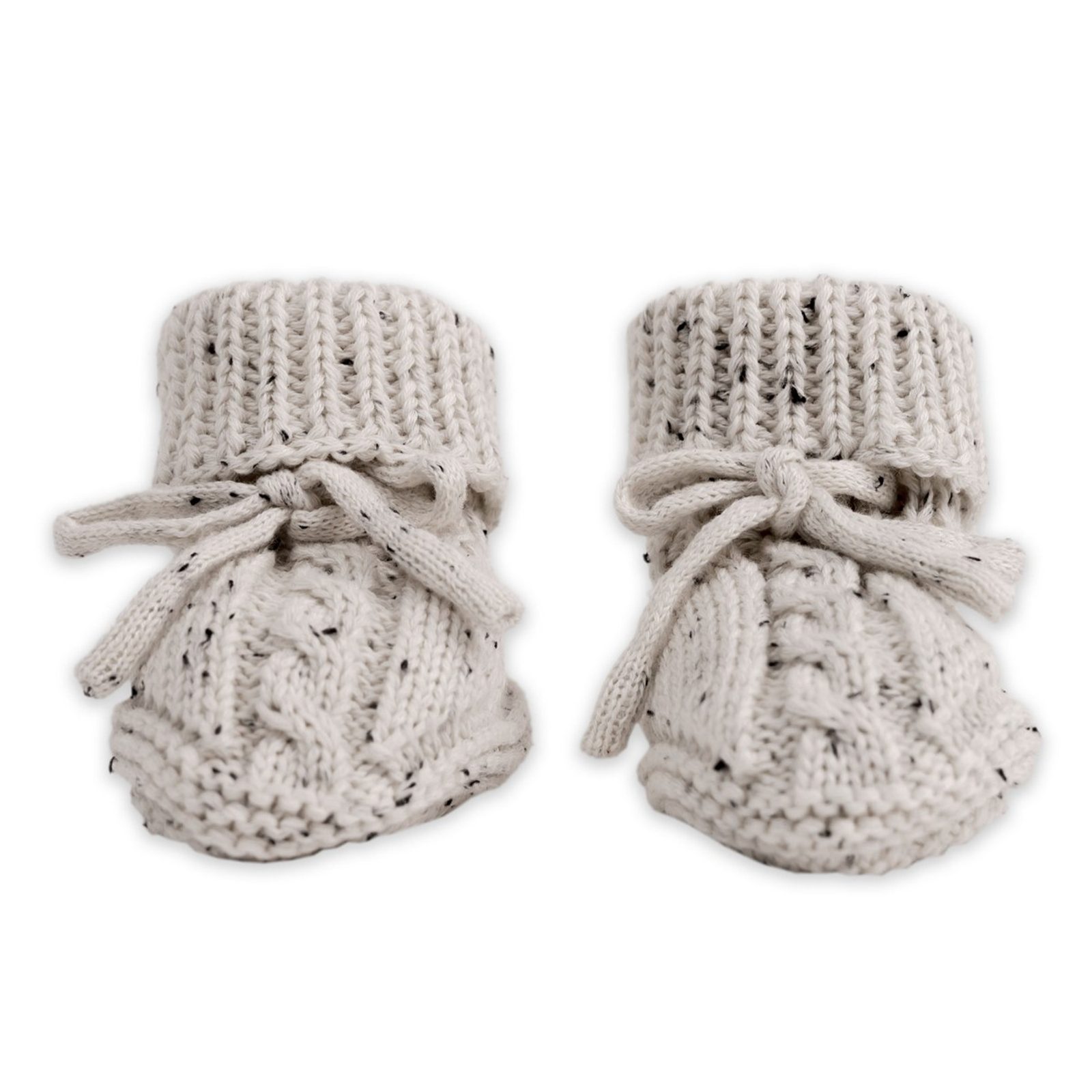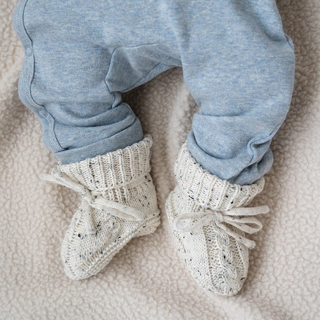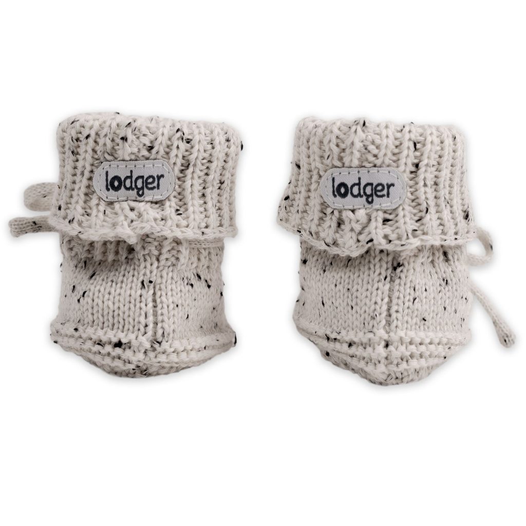 Pletené capáčky pro miminko značky Lodger - odstín Ground (krémovo-šedý melír). vhodné od narození do cca 6 měsíců, pružné díky bavlněnému úpletu, krásně přiléhají k nožičkám, snadné nasazování a sundávání, roztomilé tkaničky. Materiál: 100% bavlna.