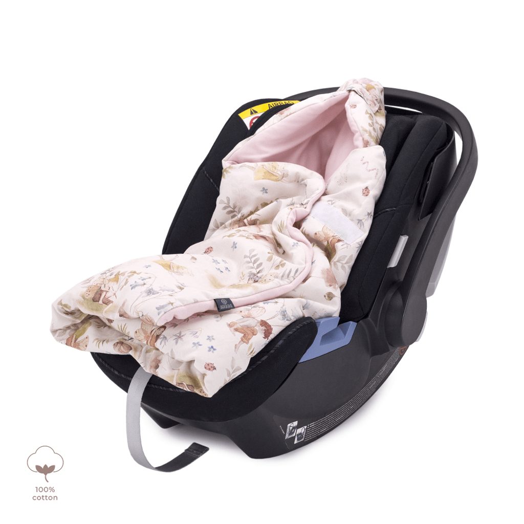 Zateplená deka/zavinovačka do autosedačky FAIRIES - jedinečná, autorská kolekce značky Makaszka. Nejnovější provedení zavinovačky - nová řada Cotton v kombinaci s vylepšenými otvory na bezpečnostní pásy!