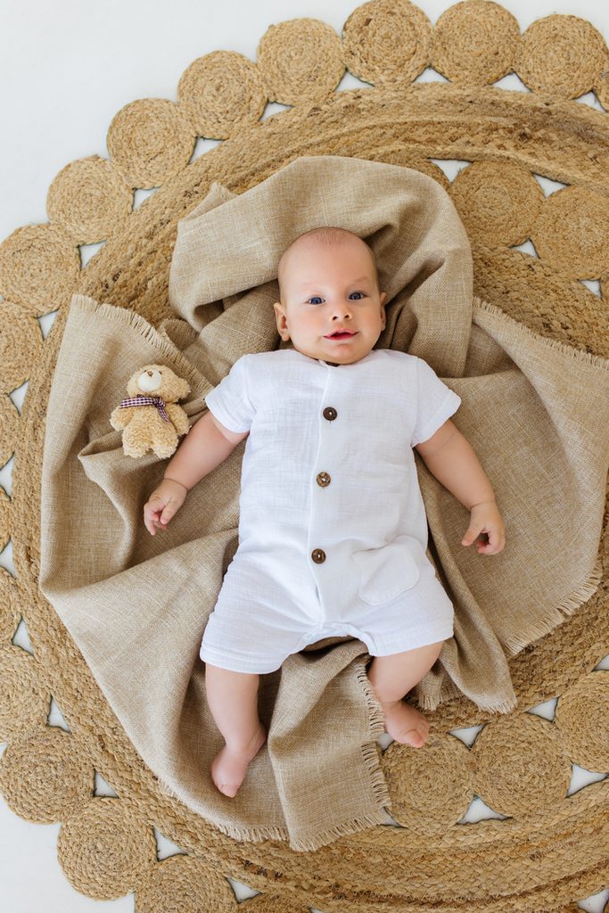 Mušelínový letní overal značky Makoma z kolekce Bamboo v modré barvě: se zapínáním v těle na knoflíčky a mezi nožičkama na patentky, limitovaná kolekce z bavlněno-bambusového mušelínu, lehká a prodyšna tkanina ideální na léto, s výraznější (režnější) 3D strukturou tkaní, materiál: 70% bavlna/ 30%…