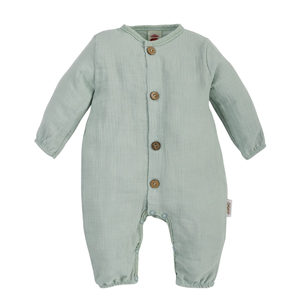 Mušelínový overal bez ťapek značky Makoma z prémiové kolekce Just Muslin v pistáciové barvě: