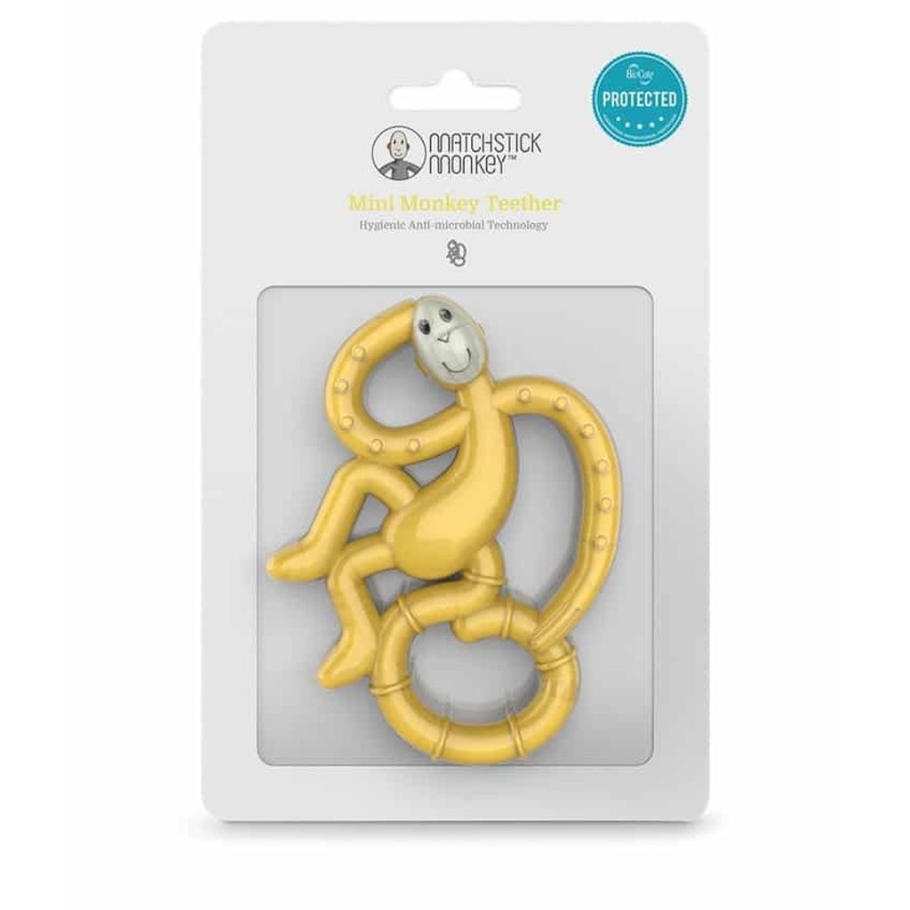 Kousátko Mini Monkey značky Matchstick Monkey s antimikrobiálním povrchem ŽLUTÉ. Jedinečné silikonové kousátko s technologií BioCote®, která zajišťuje maximální hygienu a bezpečnost při každém použití. Díky integrované antimikrobiální ochraně je výrazně sníženo riziko množení bakterií a křížové kontaminace, takže vaše miminko si může hrát i žužlat zcela bez obav.