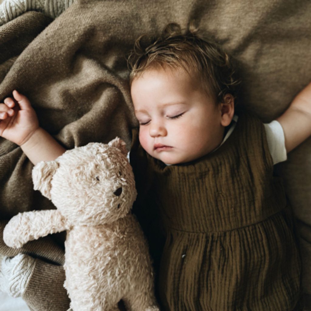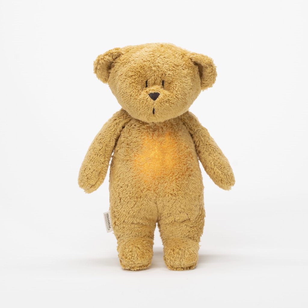Inteligentní usínáček MEDVĚD Moonie z řady Organic s funkcemi růžového šumu, nočního světla, ukolébavky a chytrým senzorem pláče. Barevné provedení: HONEY NATUR.