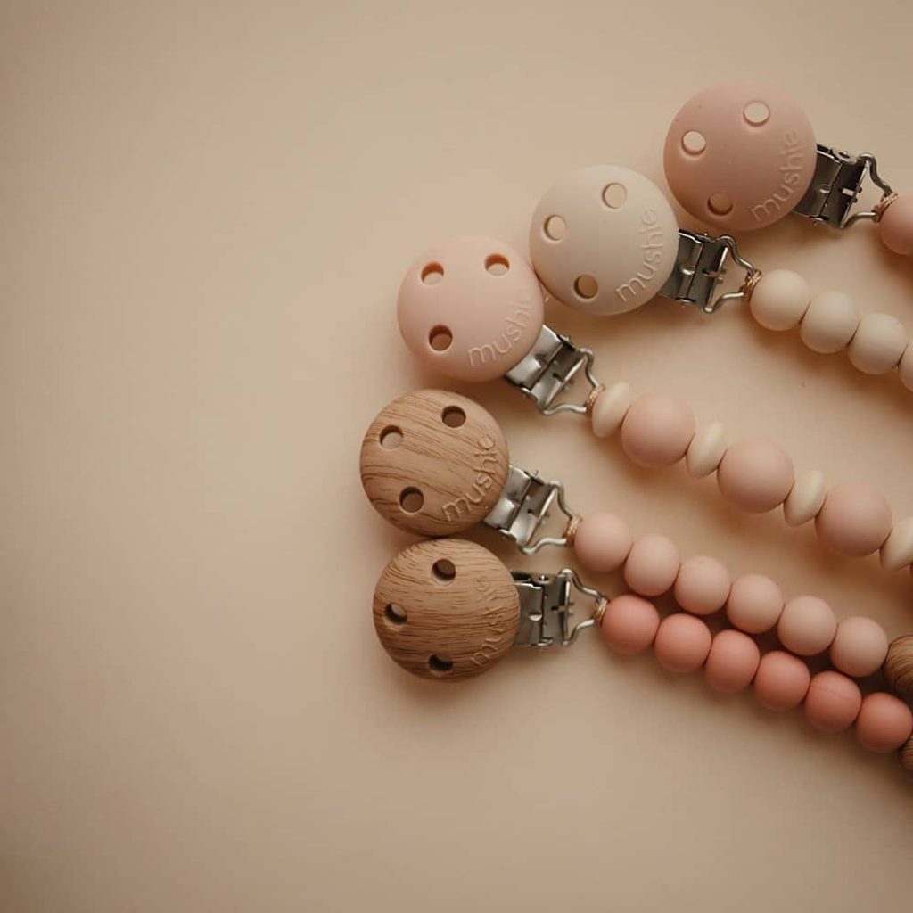 Designový klip na dudlík Eva od Mushie - barevné provedení POWDER - je spojením nadčasového minimalismu, prémiové kvality a funkčnosti.
