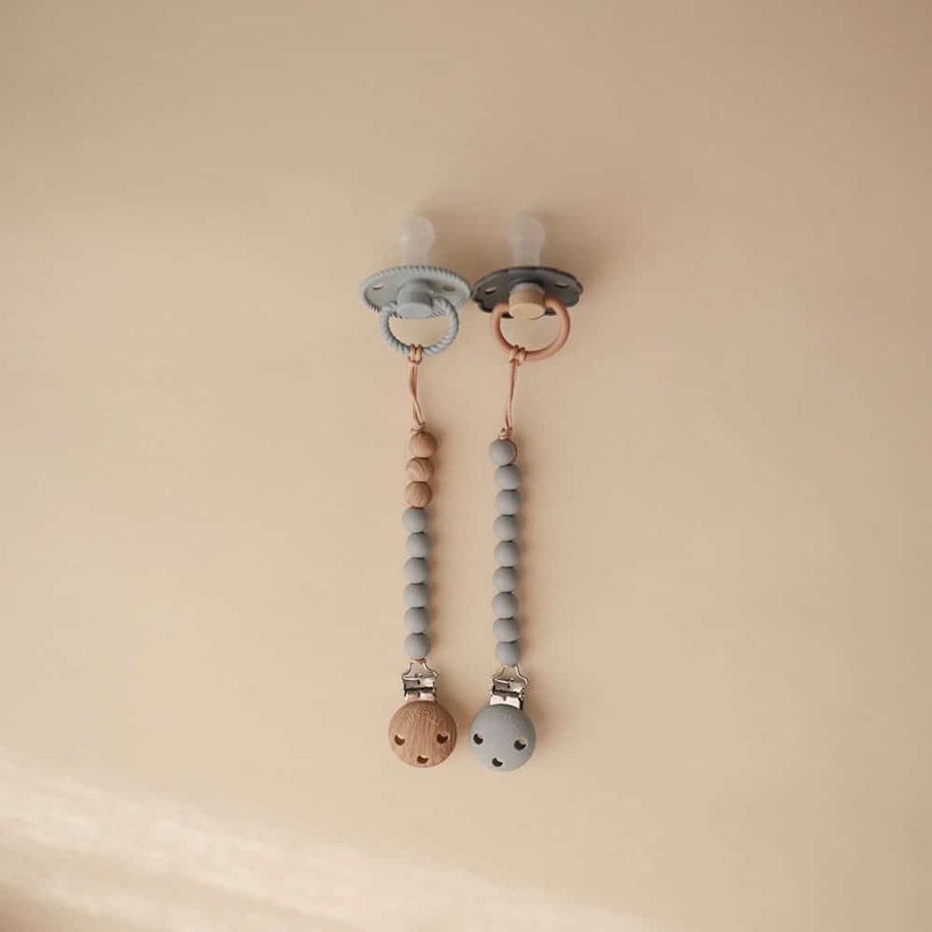 Designový klip na dudlík Eva od Mushie - barevné provedení STONE - je spojením nadčasového minimalismu, prémiové kvality a funkčnosti.