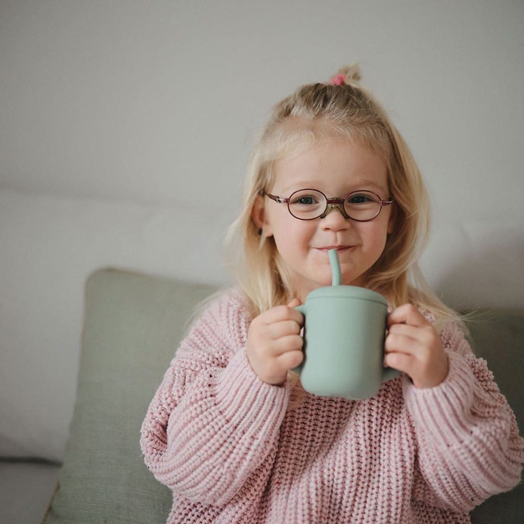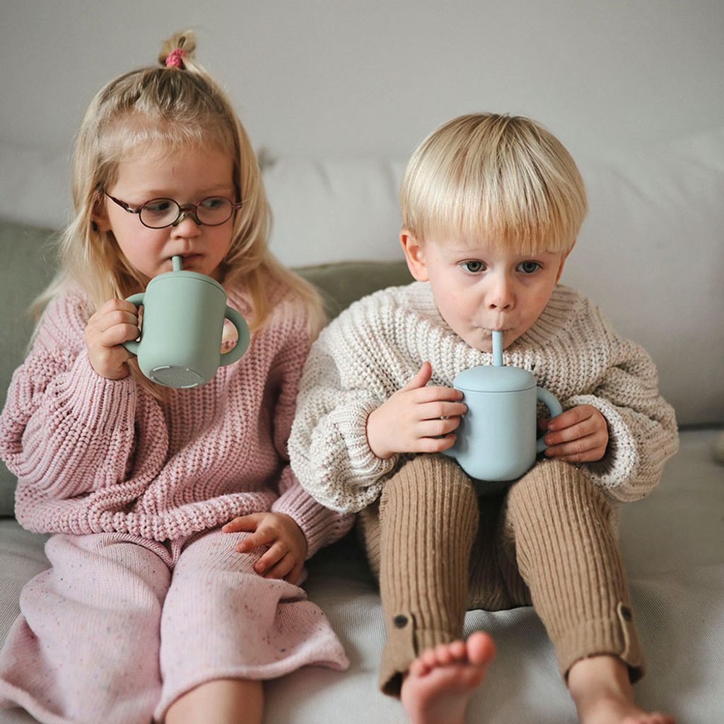 Silikonový hrneček s brčkem a oušky v odstínu TRADEWINDS - další díl do skládačky ladících setů nádobí Mushie, které nabízí stylové a originální stolování.