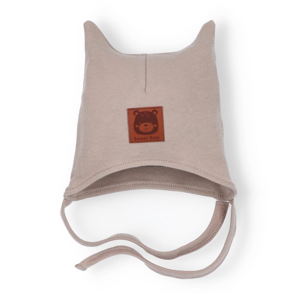 Kojenecká čepička zavazovací s oušky z kolekce Méďa Pilot značky NINI. Design: SVĚTLE HNĚDÁ.