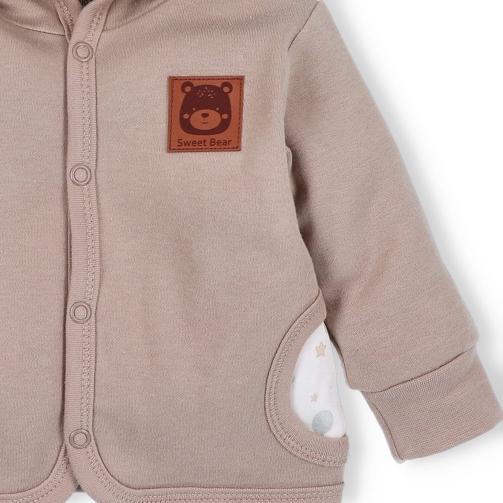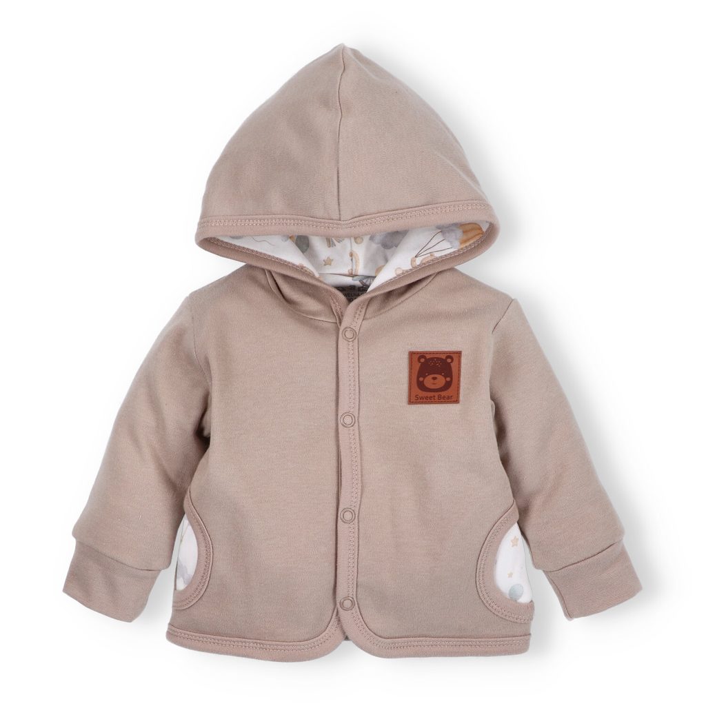Dvouvrstvá mikina s kapucí z kolekce Méďa Pilot značky NINI. Design: SVĚTLE HNĚDÁ s nášivkou na hrudi.