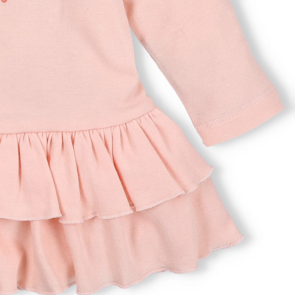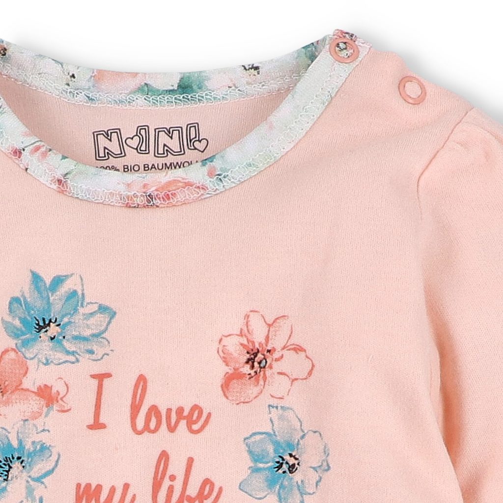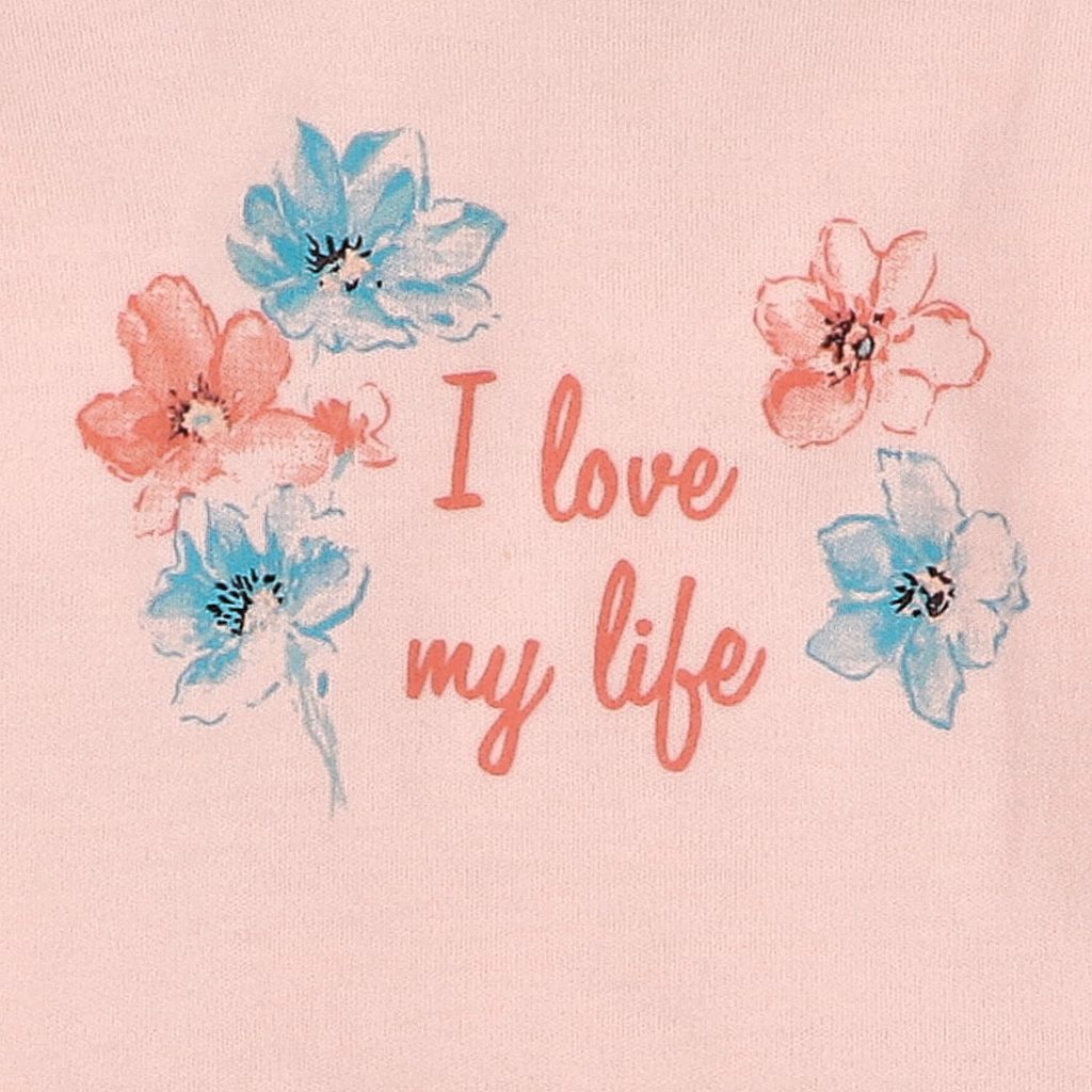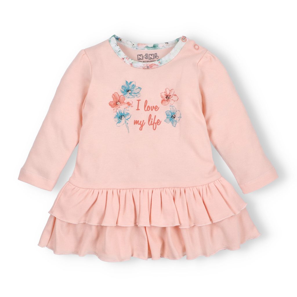 Šatičky z kolekce Meadow značky NINI. Design: meruňkové s květinovým lemováním, obrázkem květů a nápisem I love my life.