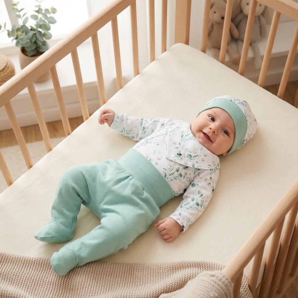 4-dílná soupravička značky NINI design Eukalypt - obsahuje desigovně sladěné: polodupačky, zavinovací body, čepičku a slintáček: mint polodupačky s širokým pružným nápletem v pase, vzorované zavinovací body, vzorovaná čepička s pružným lemem, vzorovaný slintáček se zapínáním na druky - 2 možnosti…