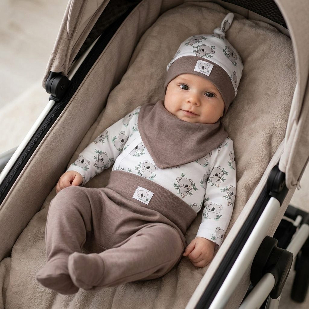 4-dílná soupravička značky NINI design Koala - obsahuje designově sladěné: polodupačky, zavinovací body, čepička a slintáček: LIMITOVANÁ KOLEKCE! hnědé polodupačky s širokým pružným nápletem v pase a ozdobnou nášivkou, zavinovací body se vzorem medvídků koala, čepička s hnědým pružným lemem, hnědý…